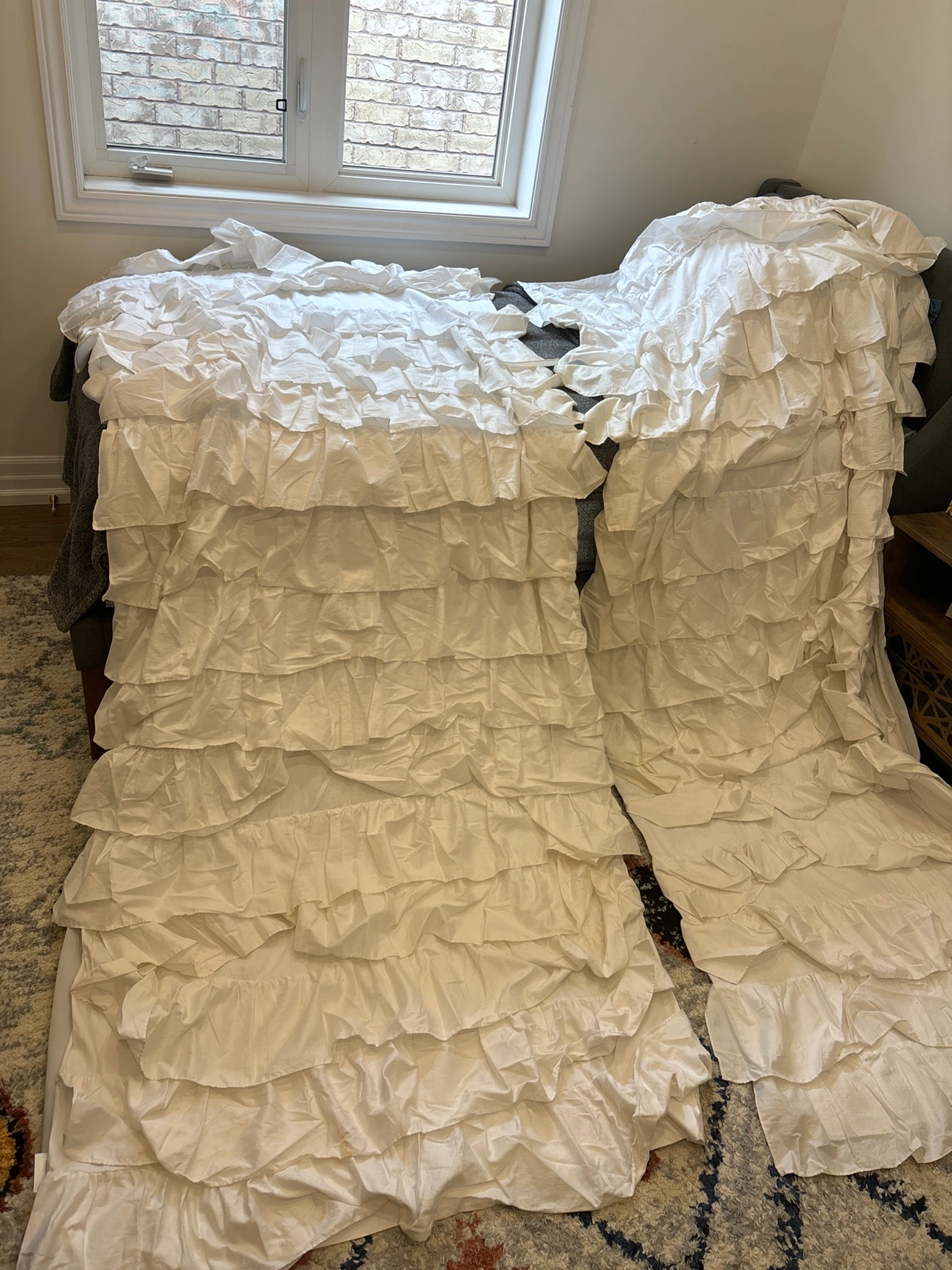 Pair of off-white ruffled curtains from Pottery Barn Kids. Measurements are 44" x 96". Dry clean only. Blackout Pickup Alton village
