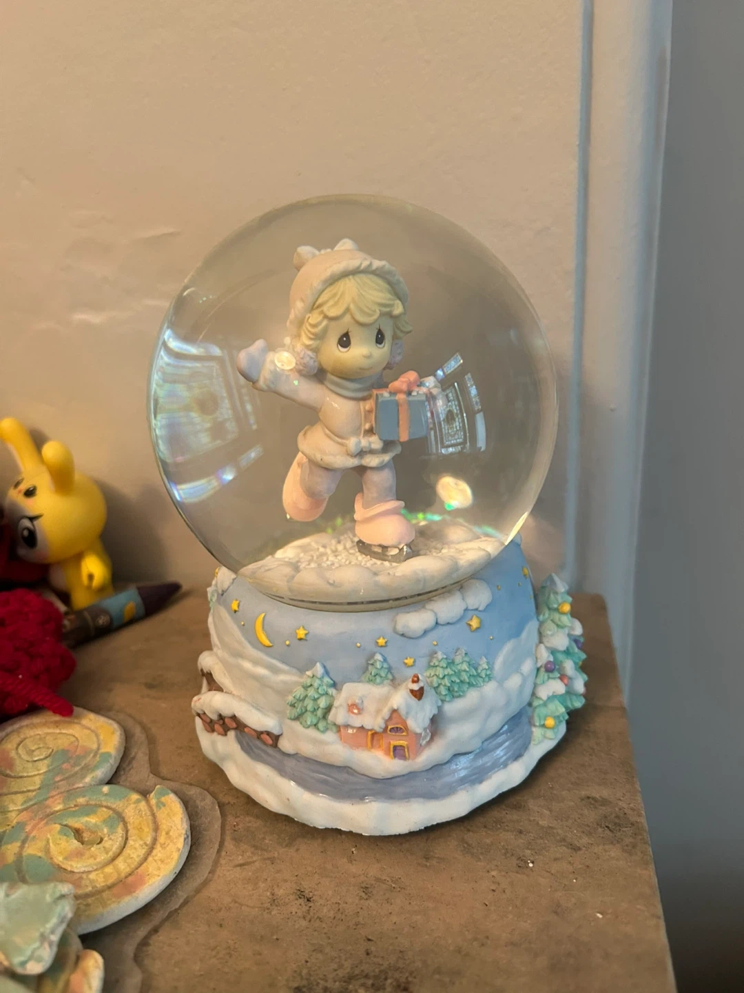 A charming Precious Moments snow globe featuring a sweet figurine! The base is decorated with a wintery scene, complete with a house, trees, and a crescent moon. It would make a lovely addition to any collection or a sweet gift!