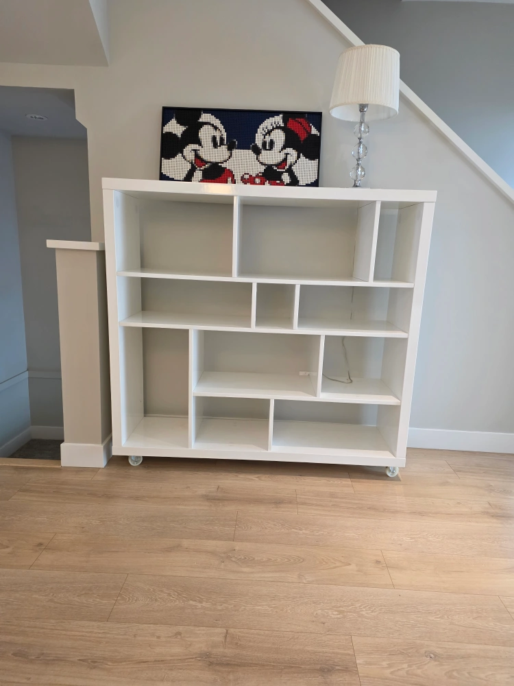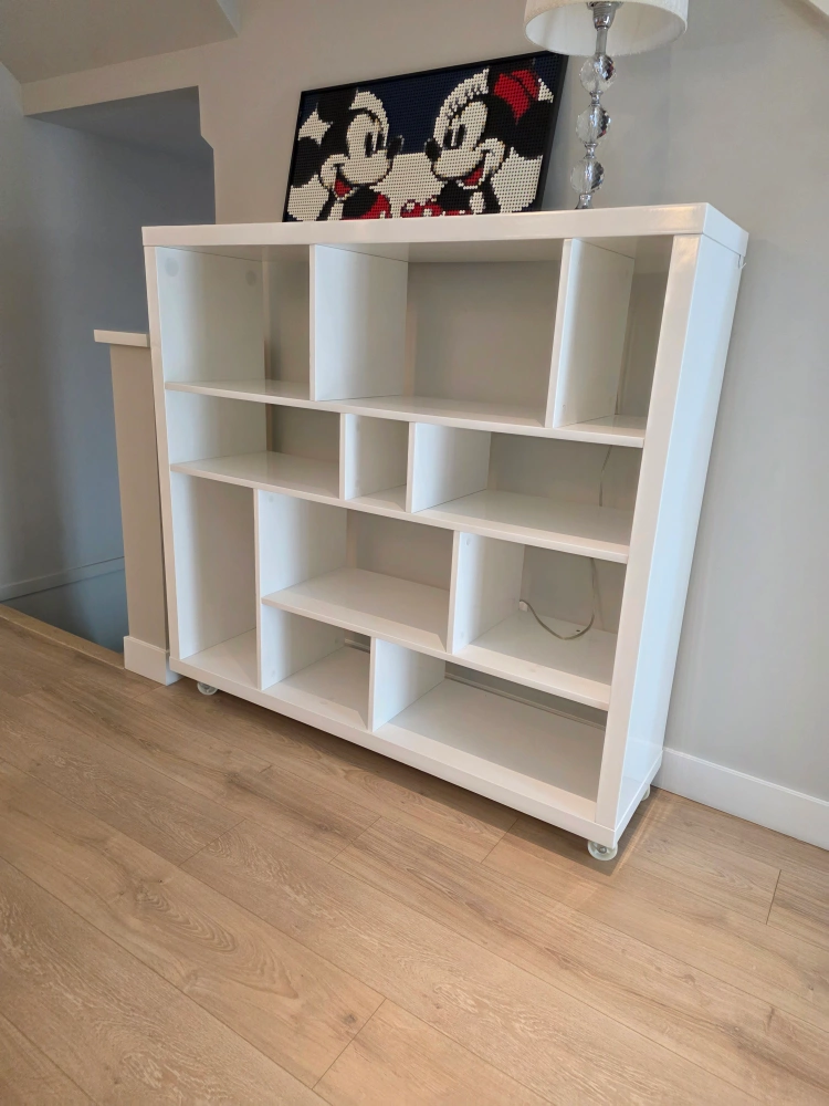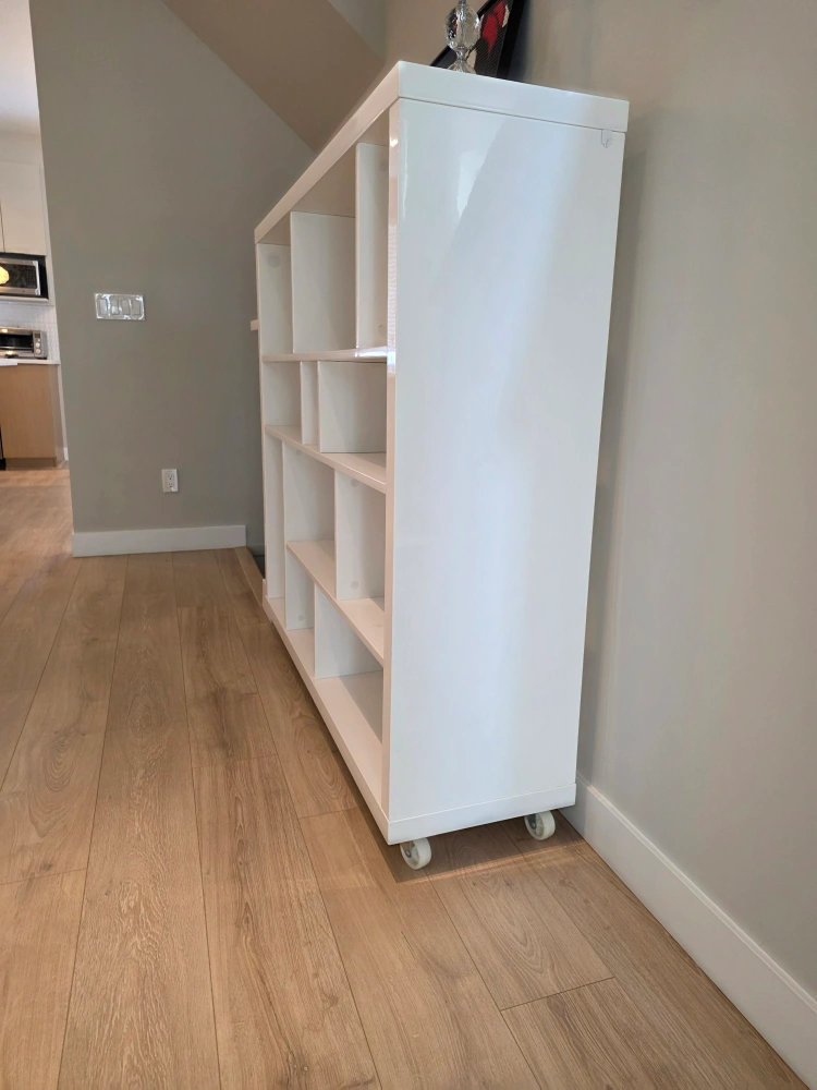 Selling a white shelving unit that’s perfect for organizing your space! It comes with wheels, making it easy to move around your home. It's in great condition and ready for a new home YOU MUST BE STRONG ENOUGH TO MOVE THIS ITEM DOWN THE STAIRS OF OUR TOWNHOUSE