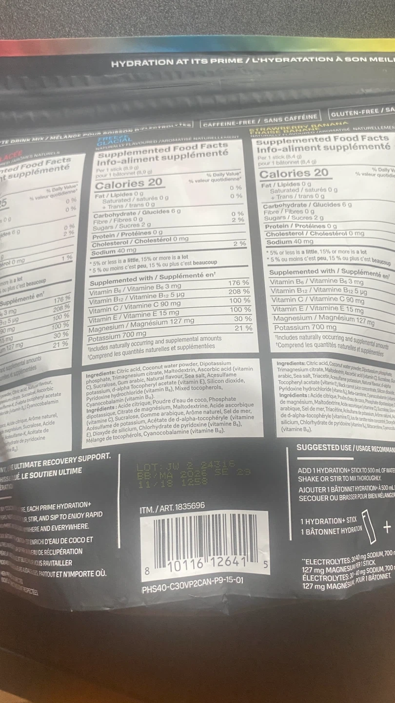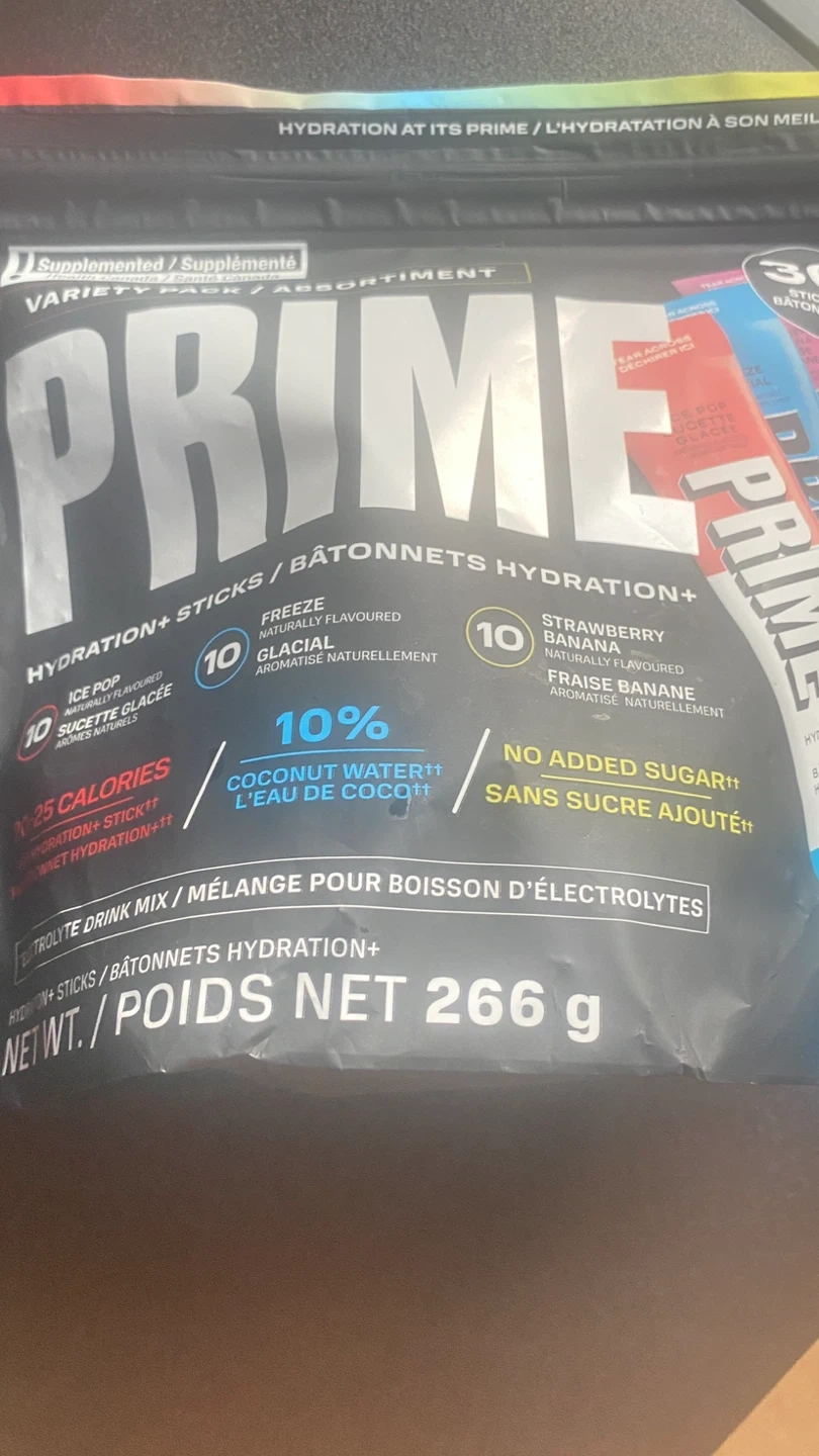 Selling a PRIME Hydration+ Sticks Variety Pack. This pack contains 30 sticks, perfect for on-the-go hydration. It includes a mix of flavours like Ice Pop, Glacial Freeze, and Strawberry Banana. Each stick has only 20 calories and no added sugar! The net weight of the pack is 266g. Expiry date is 2026 September 28