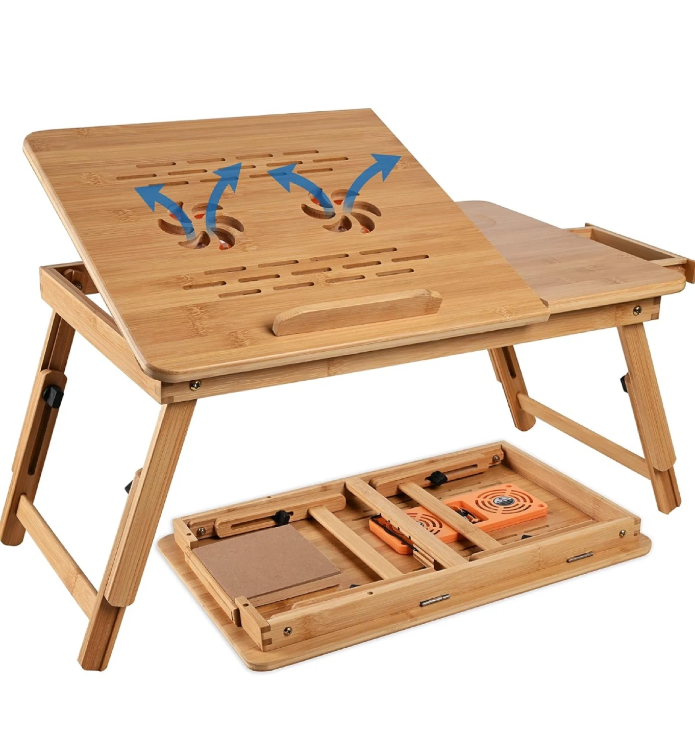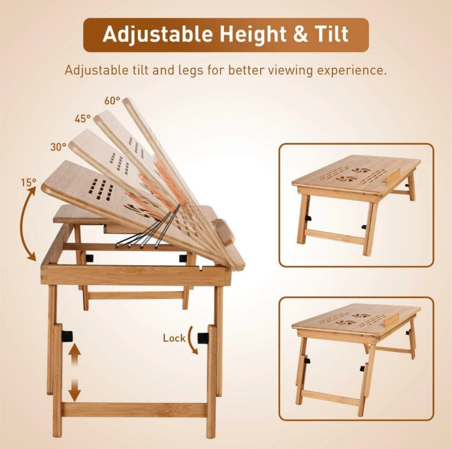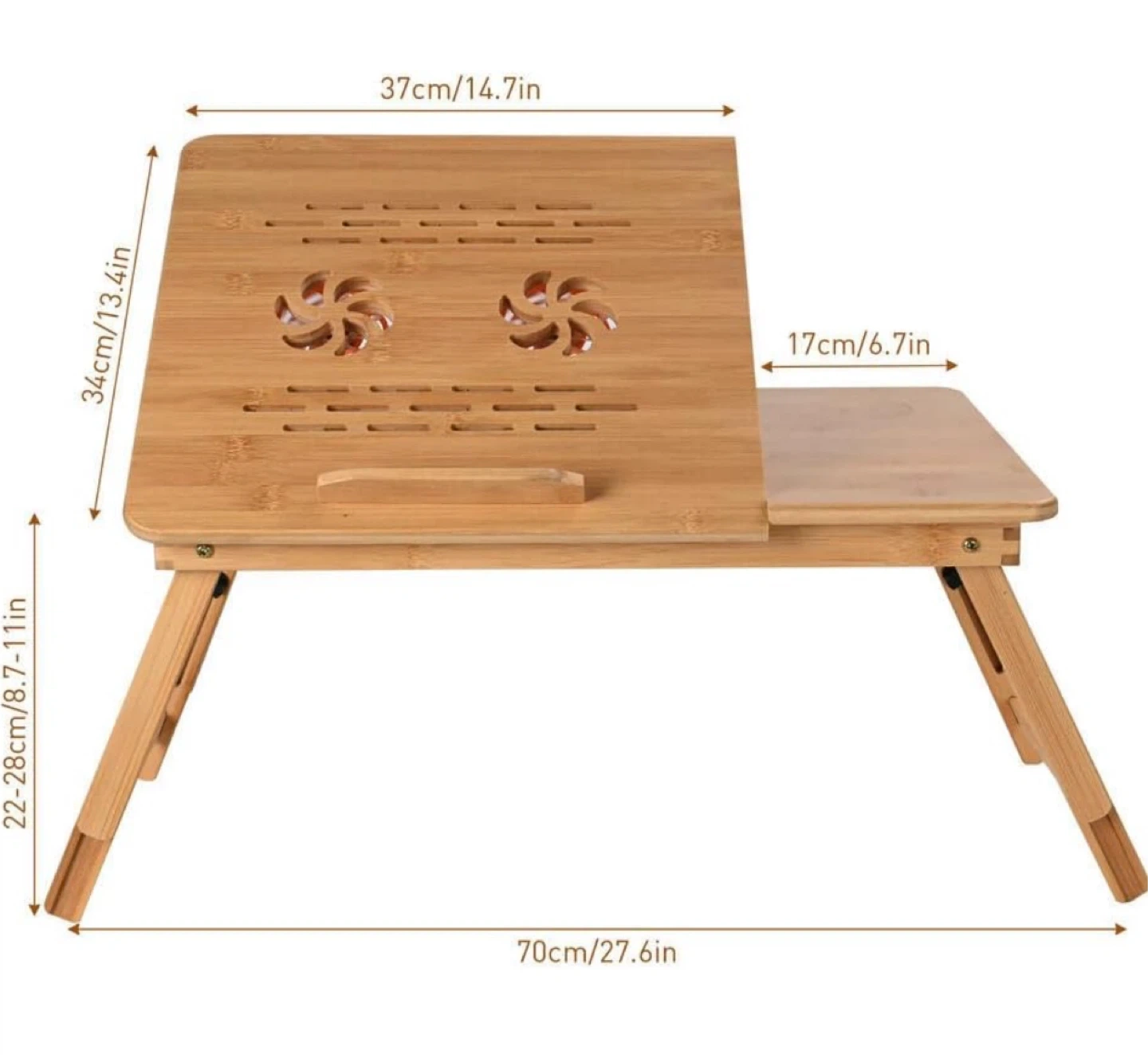 Selling a bamboo laptop desk that's perfect for working from home or relaxing in bed! It features: - Adjustable height and tilt for a better viewing experience - Dimensions: 37cm/14.7in (height), 34cm/13.4in (width), 17cm/6.7in (side table), 70cm/27.6in (length) - Adjustable legs from 22-28cm/8.7-11in It's lightweight and portable, making it easy to move around your space For further details please refer to: https://www.amazon.ca/gp/aw/d/B0BD89B7Q1?psc=1&ref=ppx_pop_mob_b_asin_title