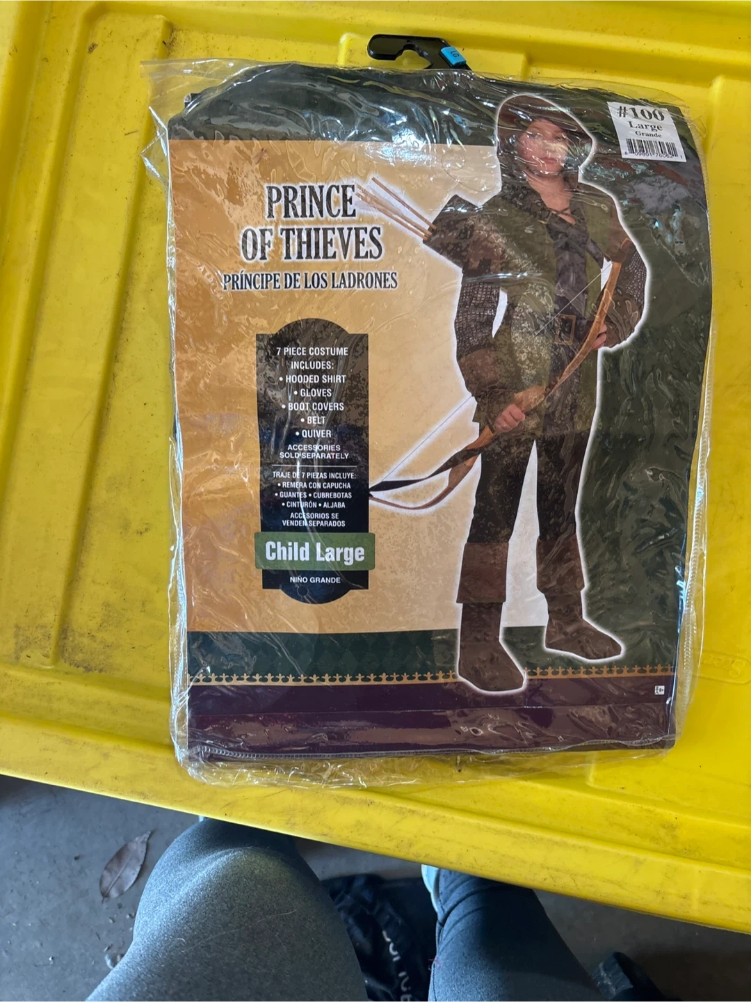 Selling a brand new, still-in-packaging Prince of Thieves costume for kids! This is a 7-piece costume that includes a hooded shirt, gloves, boot covers, a belt, and a quiver. Size is Child Large.