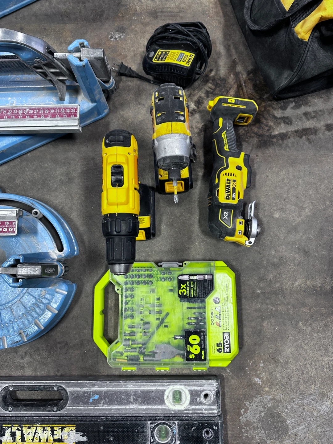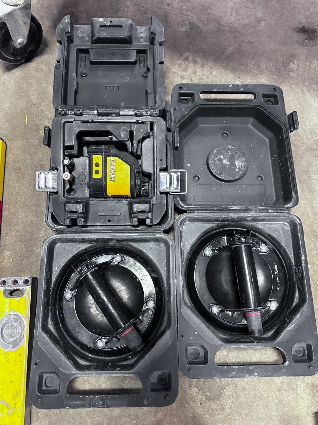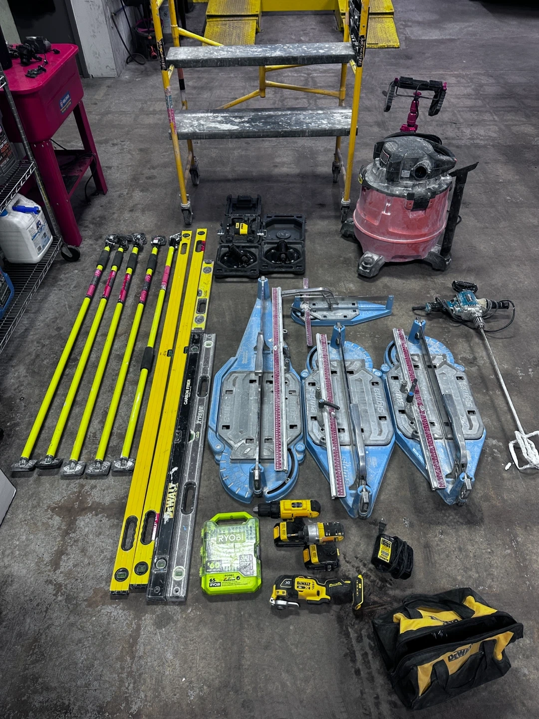 Measuring & Layout Tools • 5 yellow telescoping poles with clamps • 4 spirit levels (various lengths, including STABILA and DeWALT brands) Cutting & Tile Tools • 4 manual tile cutters (blue base with red cutting guides) Power Tools (DeWALT – Yellow/Black) • 1 cordless drill/driver • 1 cordless impact driver • 1 cordless oscillating multi-tool • 2 rechargeable batteries • 1 DeWALT contractor tool bag Other Power Tools • 1 Makita angle grinder (blue) Accessories & Consumables • 1 Ryobi drill/driver bit set (65-piece, green case) Heavy Equipment • 1 wet/dry shop vacuum (red, with black and pink attachments) • 1 yellow rolling scaffold platform Specialty Tools • 2 suction cup lifters (inside black cases)