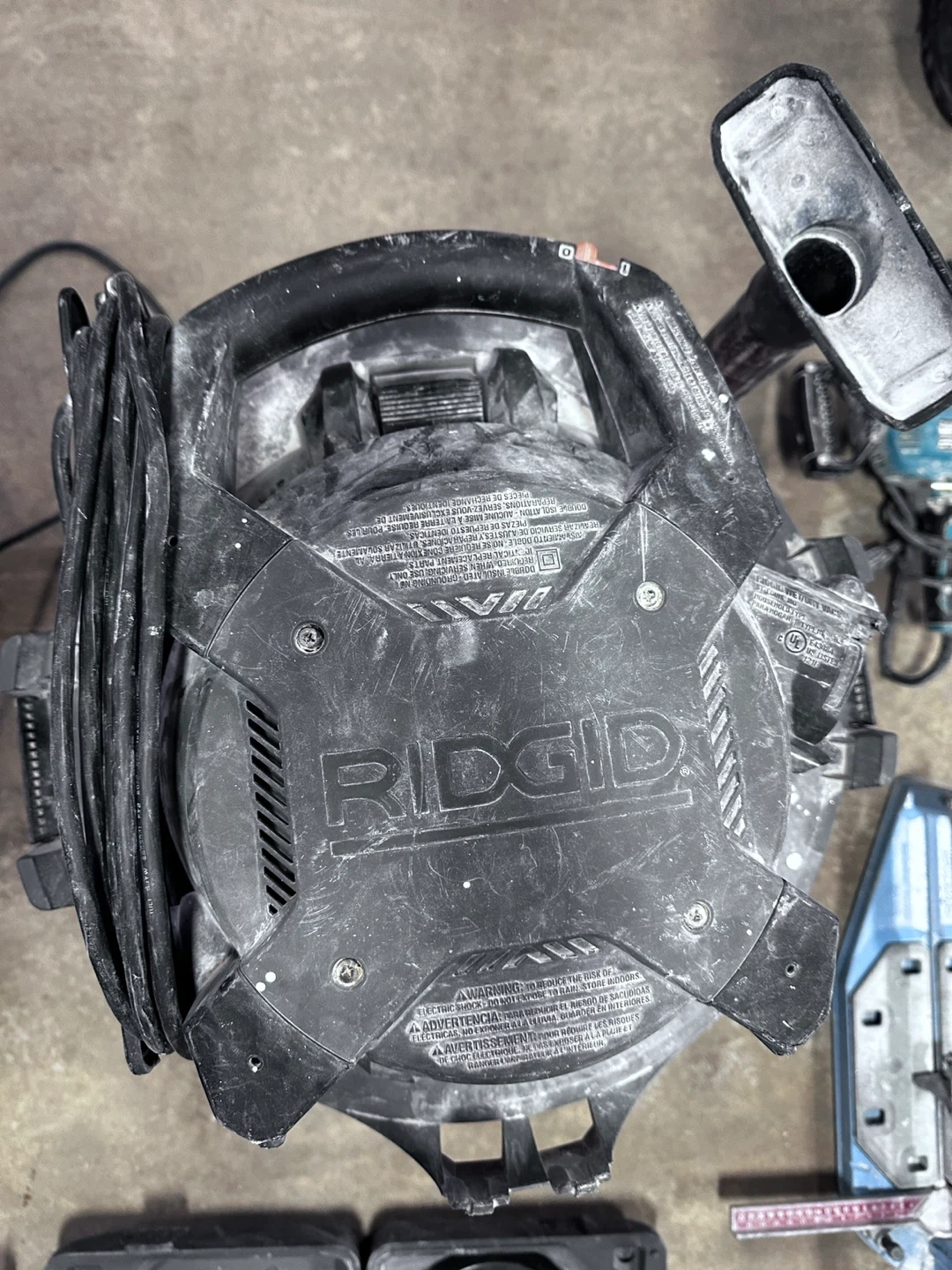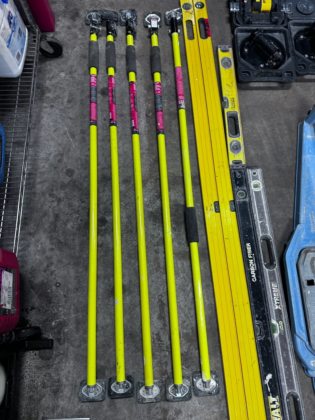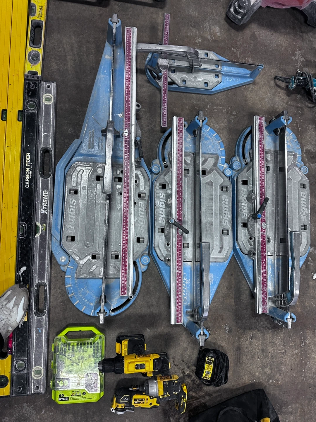Measuring & Layout Tools • 5 yellow telescoping poles with clamps • 4 spirit levels (various lengths, including STABILA and DeWALT brands) Cutting & Tile Tools • 4 manual tile cutters (blue base with red cutting guides) Power Tools (DeWALT – Yellow/Black) • 1 cordless drill/driver • 1 cordless impact driver • 1 cordless oscillating multi-tool • 2 rechargeable batteries • 1 DeWALT contractor tool bag Other Power Tools • 1 Makita angle grinder (blue) Accessories & Consumables • 1 Ryobi drill/driver bit set (65-piece, green case) Heavy Equipment • 1 wet/dry shop vacuum (red, with black and pink attachments) • 1 yellow rolling scaffold platform Specialty Tools • 2 suction cup lifters (inside black cases)