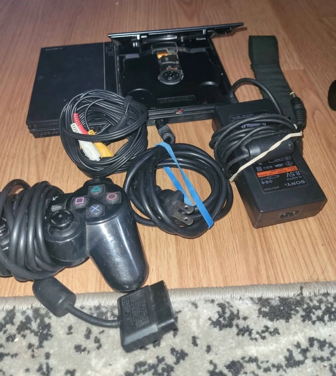 - Ps2 Slim With Controller, AV cable, Ac Adapter, 2 Prong AC Power Cord -The strap hold the lid shut - Everything Works - I'm downsizing for studies