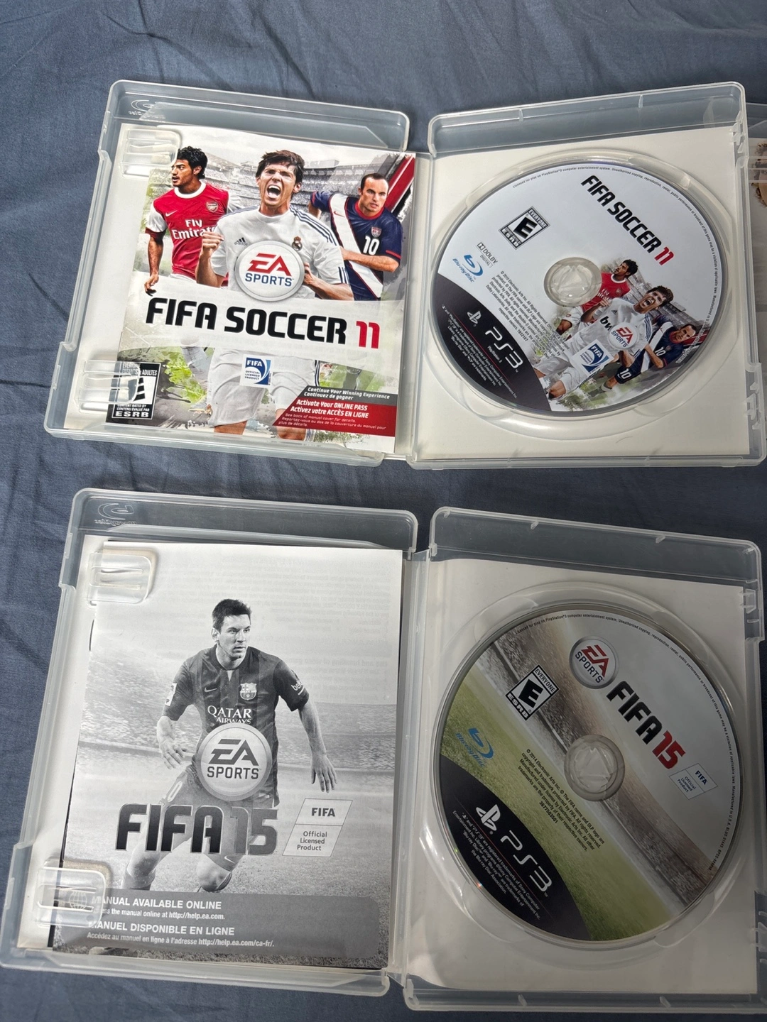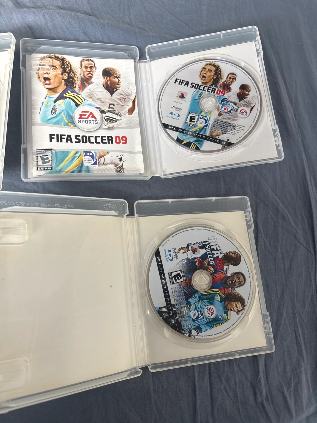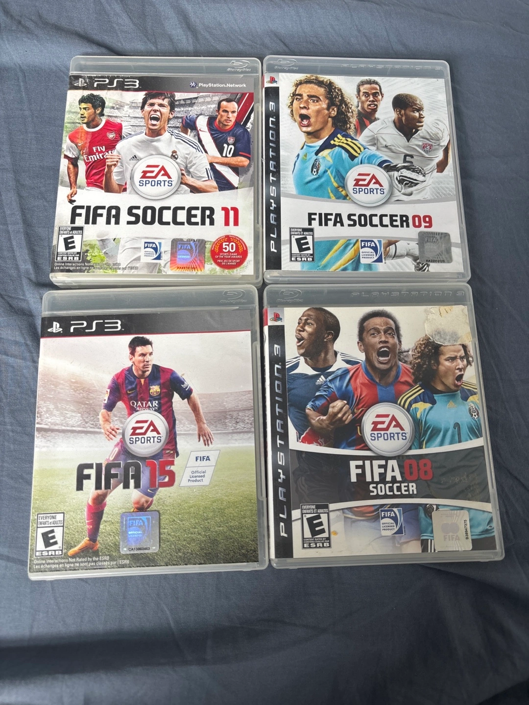 I'm selling a set of four FIFA soccer games for the PlayStation 3. The games included are FIFA 08, FIFA Soccer 09, FIFA Soccer 11, and FIFA 15. They come in their original cases. All discs are in good working condition with minimal signs of wear. I'm selling these as a bundle, but I'm open to offers for individual games as well. Please contact me with any questions.
