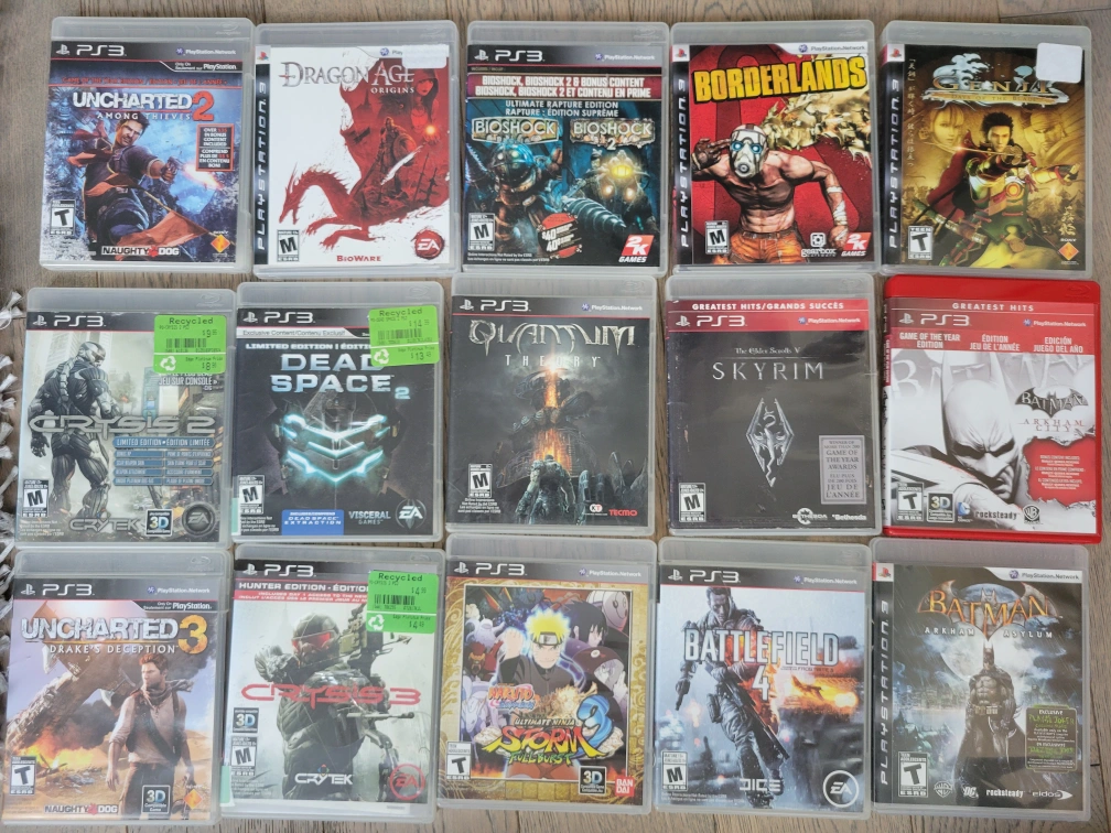 Selling a collection of PS3 games! Titles include: - Uncharted 2: Among Thieves - Dragon Age: Origins - Bioshock 1 & 2 Ultimate Rapture Edition - Borderlands - Genji: Days of the Blade - Crysis 2 Limited Edition - Dead Space 2 Limited Edition - Quantum Theory - The Elder Scrolls V: Skyrim - Batman: Arkham City Game of the Year Edition - Uncharted 3: Drake's Deception - Crysis 3 Hunter Edition - Naruto Shippuden: Ultimate Ninja Storm 3 - Battlefield 4 - Batman: Arkham Asylum