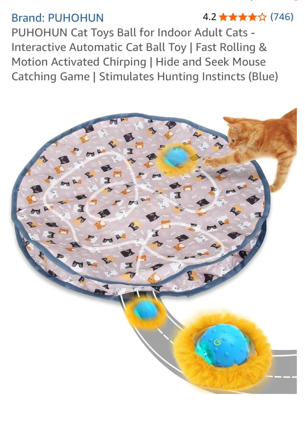 Keep your kitty entertained with this interactive cat toy ball from PUHOHUN! It features automatic motion and chirping to stimulate your cat's hunting instincts. It also has an auto-off feature that gives kitty a breather after 5 minutes. The set includes a Type-C USB cable for charging, and it only takes 2 hours to fully charge. It also comes with the original box! Cash only
