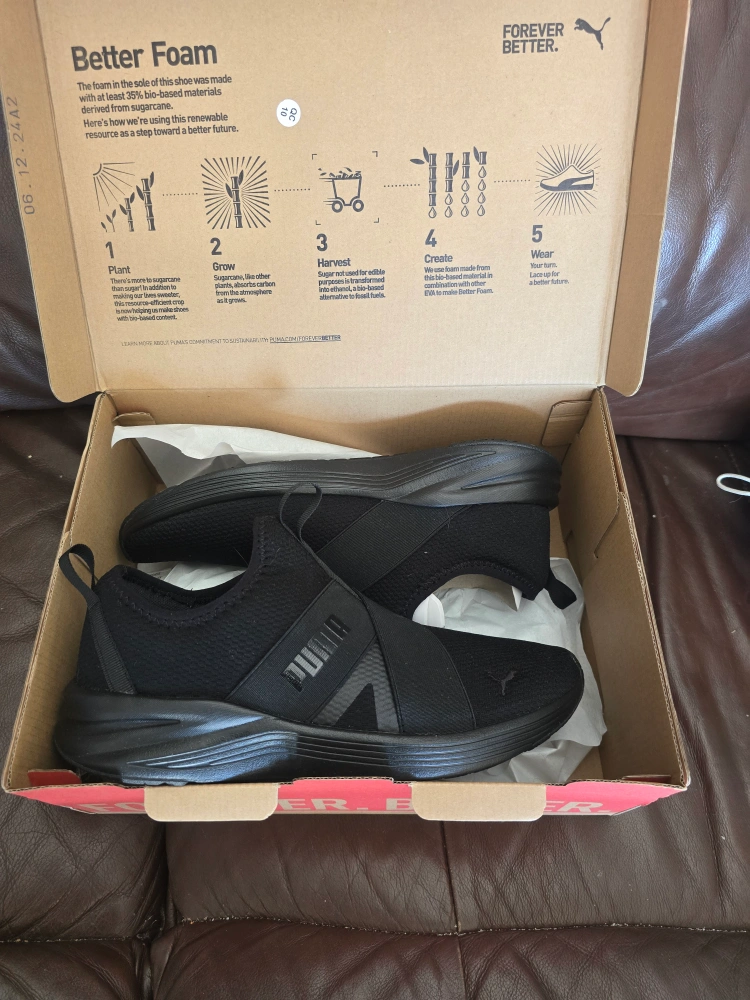 Selling a pair of Puma Better Foam sneakers in black. They're in like-new condition and come with the original box! The foam in the sole is made with at least 35% bio-based materials derived from sugarcane, making them a more sustainable choice