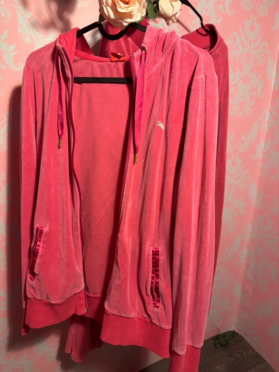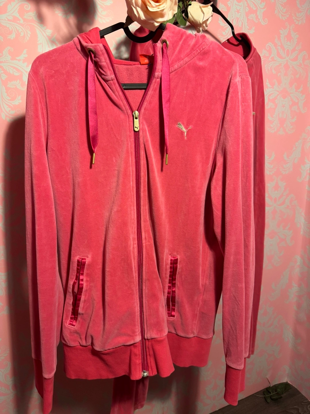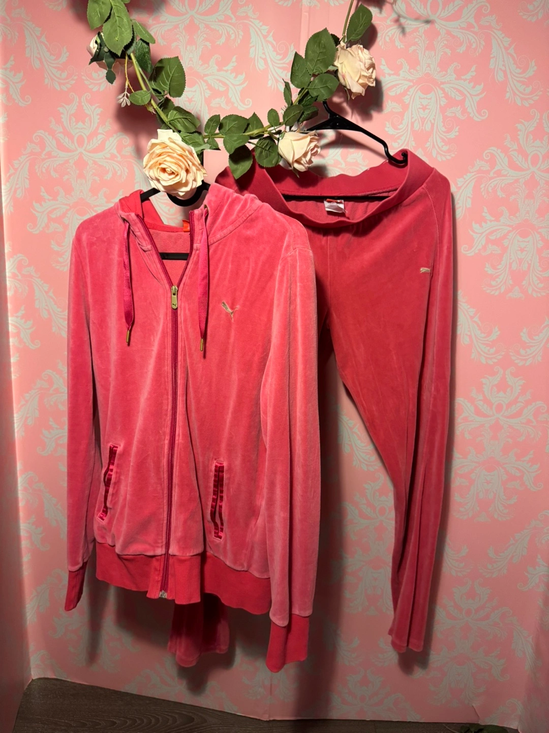 Selling a Puma pink velour tracksuit! It's super comfy and stylish. The set includes a zip-up hoodie and matching pants. Perfect for lounging or running errands!
