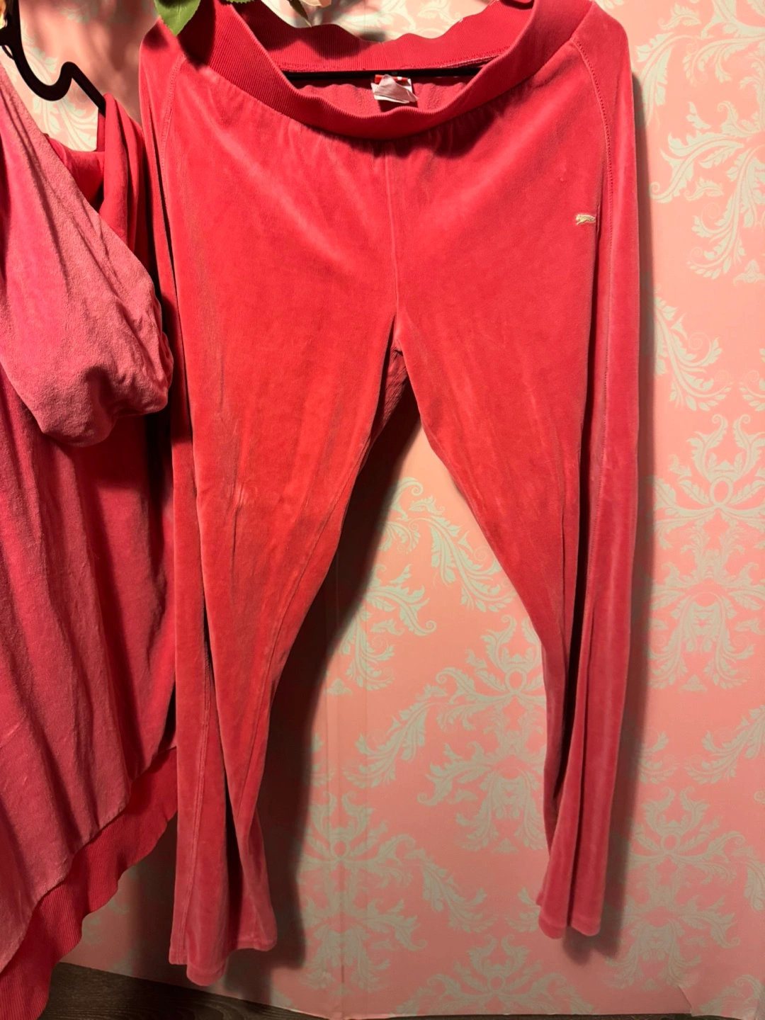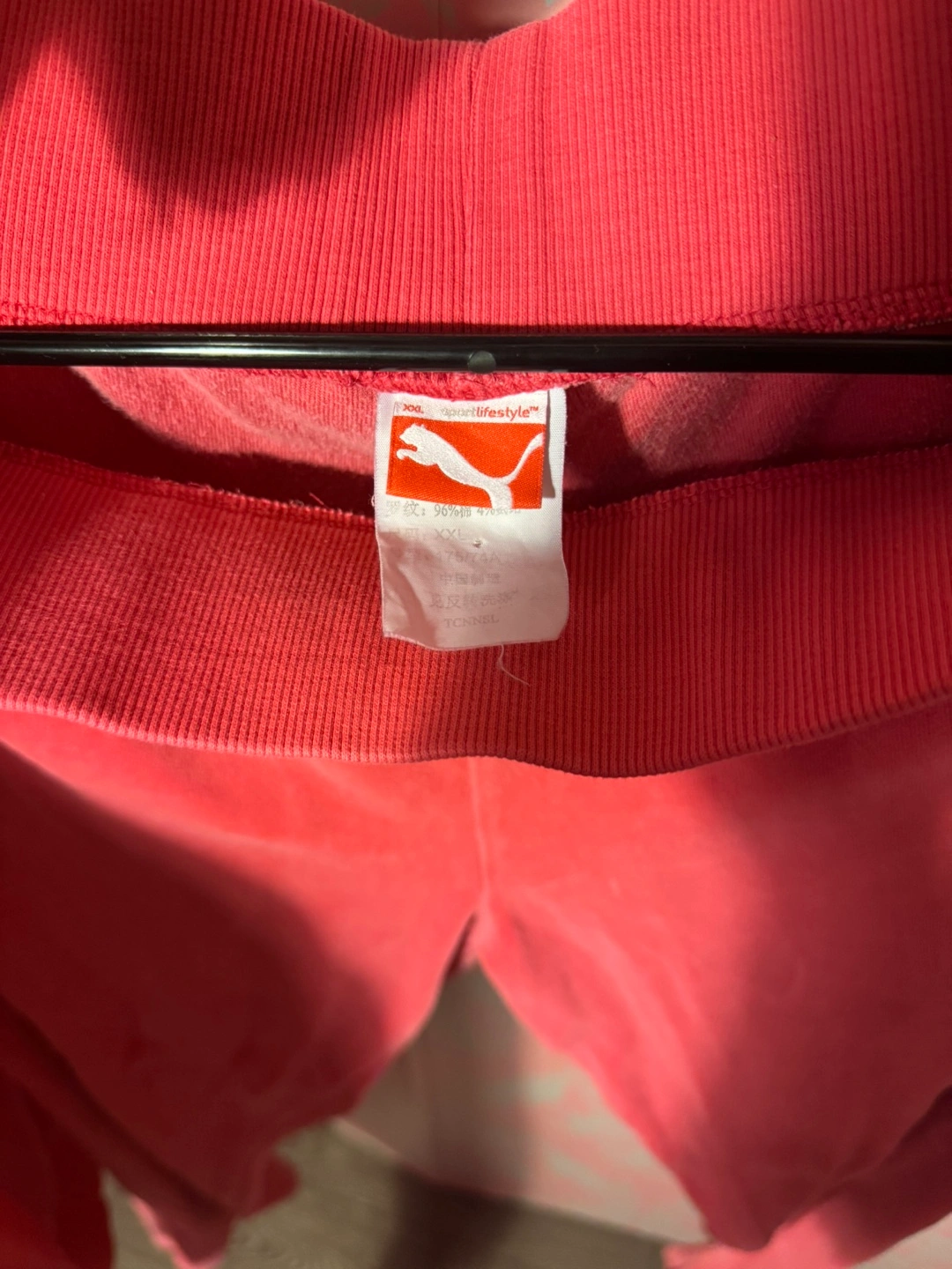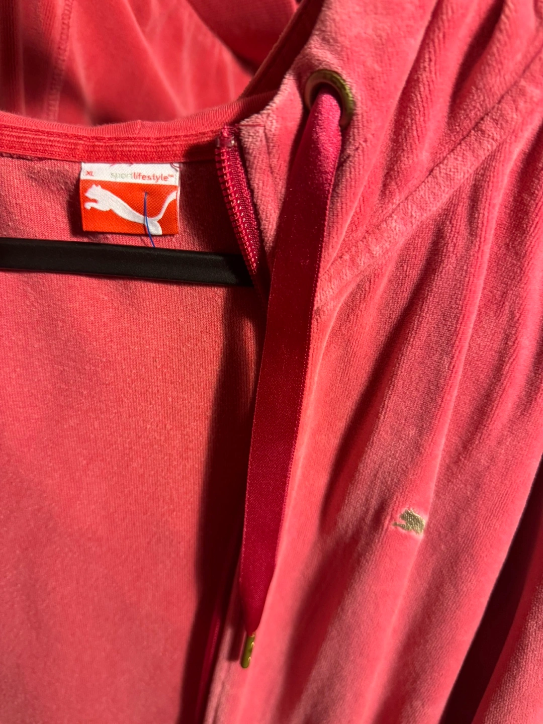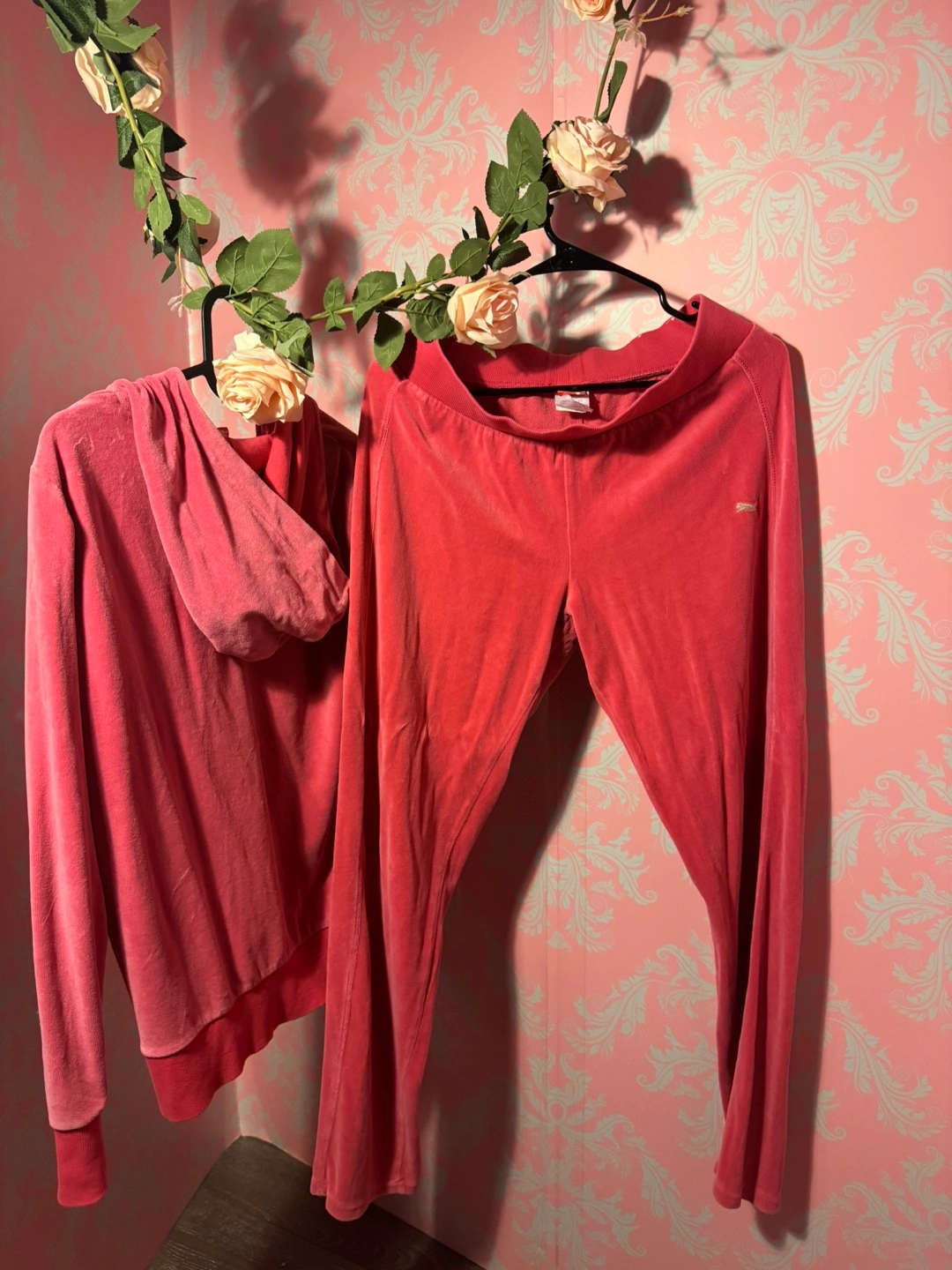 Selling a Puma pink velour tracksuit! It's super comfy and stylish. The set includes a zip-up hoodie and matching pants. Perfect for lounging or running errands!