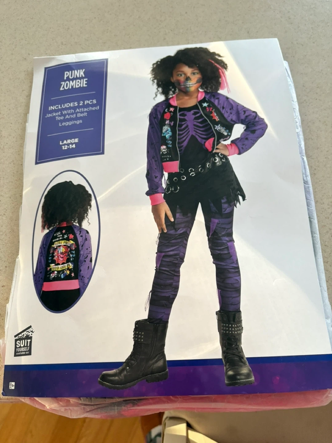 Selling a Punk Zombie costume in size large (12-14)! This costume includes 2 pieces: a jacket with an attached tee and belt, and leggings. Perfect for Halloween or dress-up!