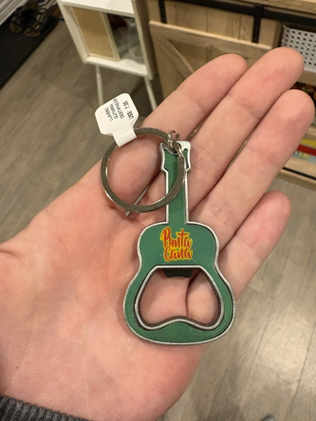 Selling a fun Punta Cana guitar-shaped bottle opener keychain! It's green and has the words 'Punta Cana' on it in a cool, colourful font. Perfect for adding a bit of vacation vibe to your keys or backpack