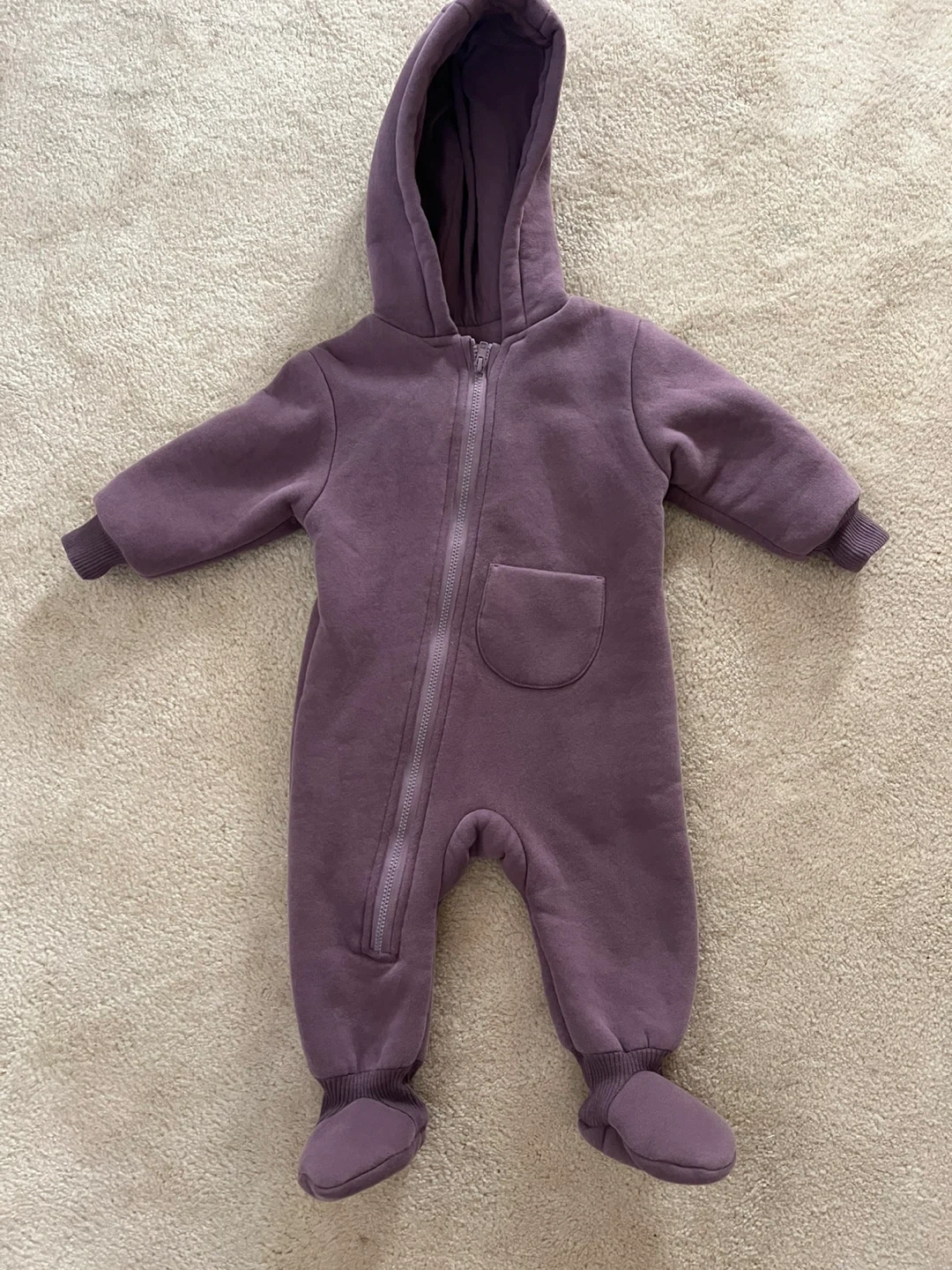 Selling a cute purple baby onesie with a hood! Two times used. Perfect for keeping your little one warm and cozy. Made in Europe.