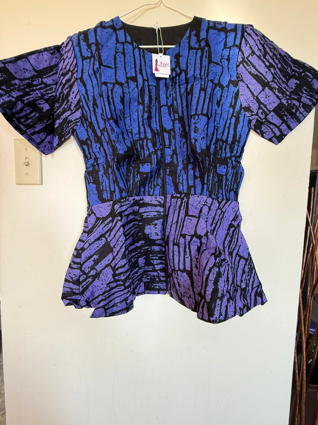 Short sleeve peplum top. Features a front zipper and an abstract Ankara print. Relaxed fit. Perfect for summer.