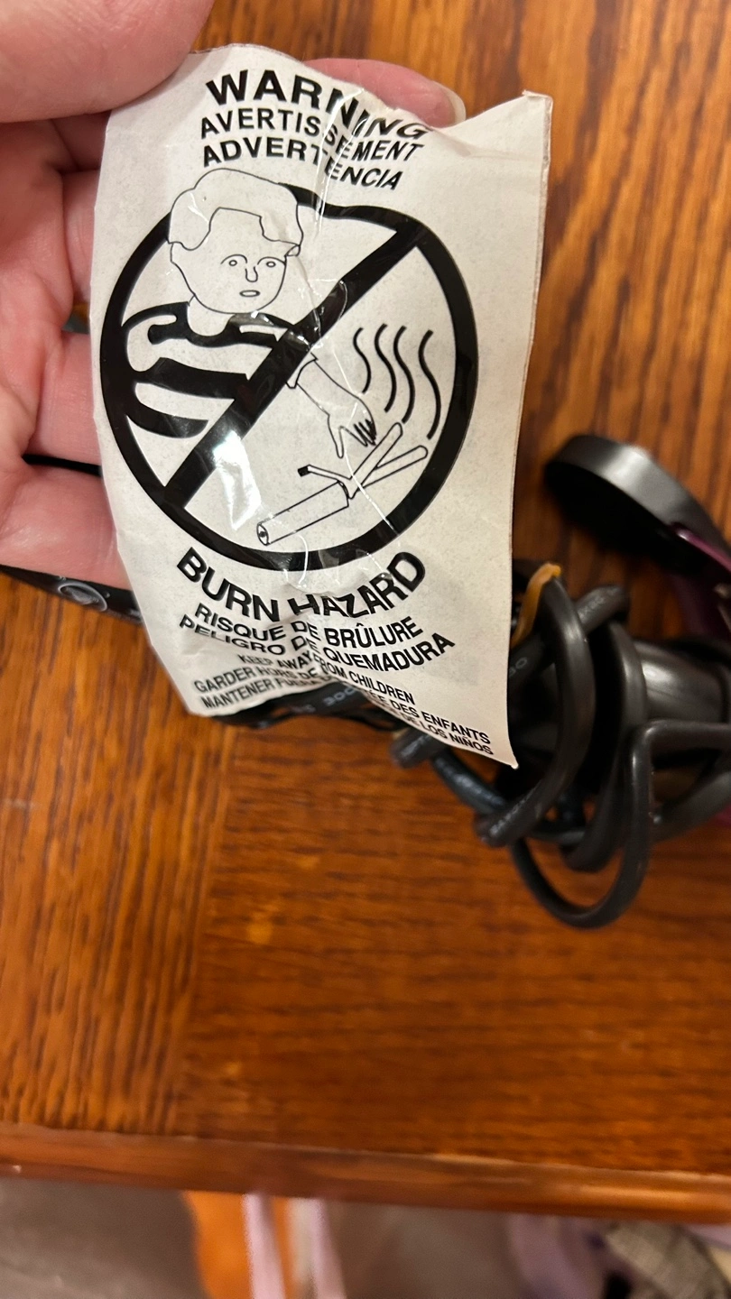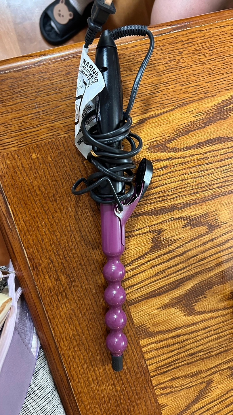 Used purple curling iron. Features a clamp and a barrel with multiple nodules. Includes power cord. Burn hazard warning label attached.