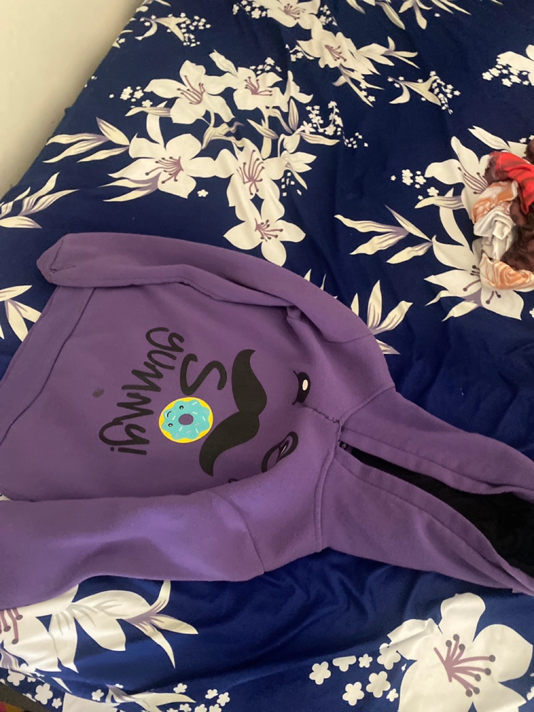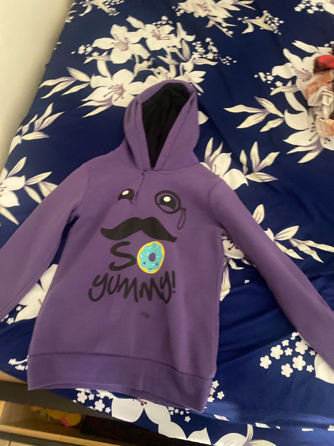 A cute purple hoodie with a fun "So Yummy" design! It's in great condition and ready for a new home. Perfect for keeping cozy on cooler days