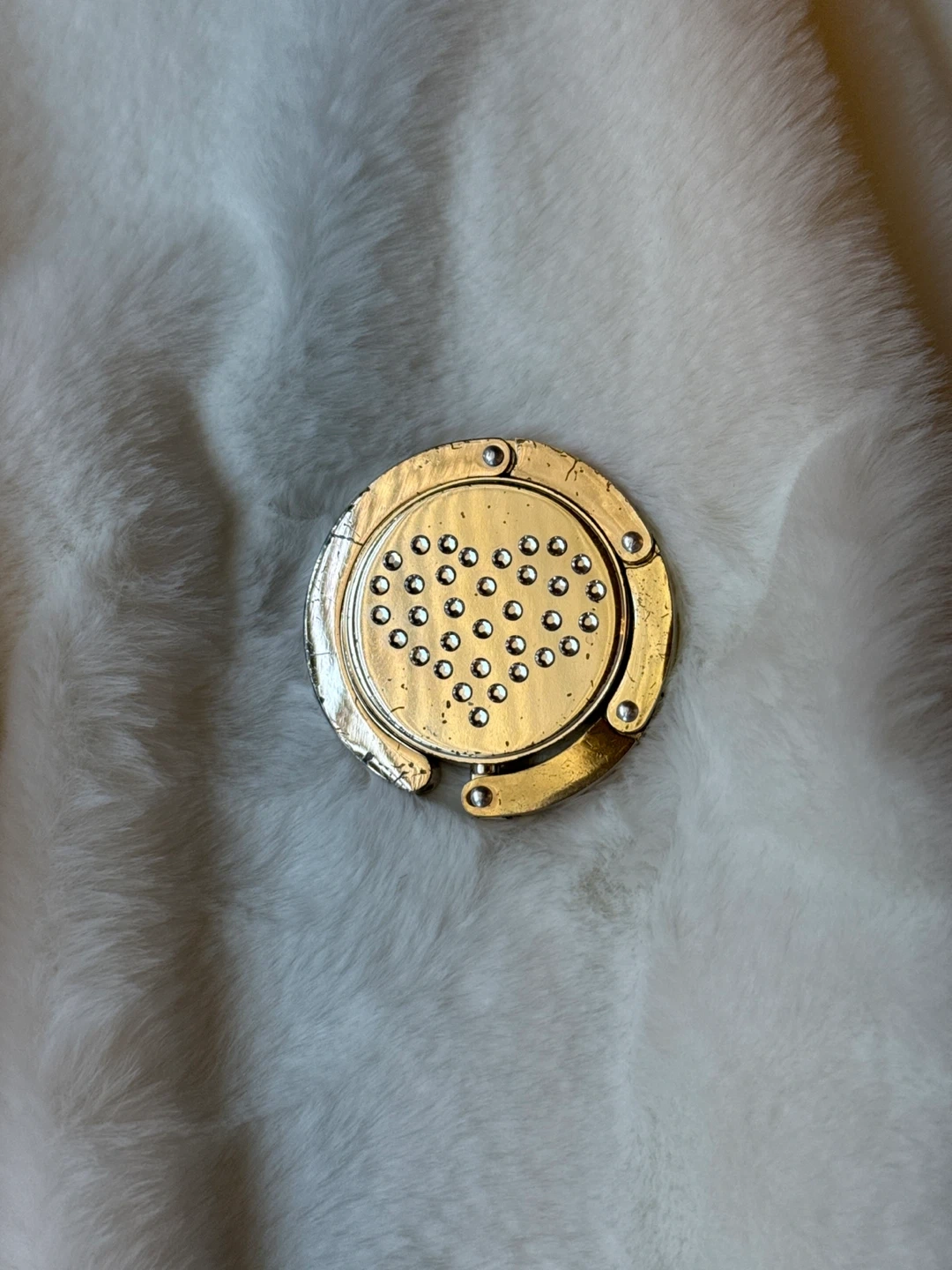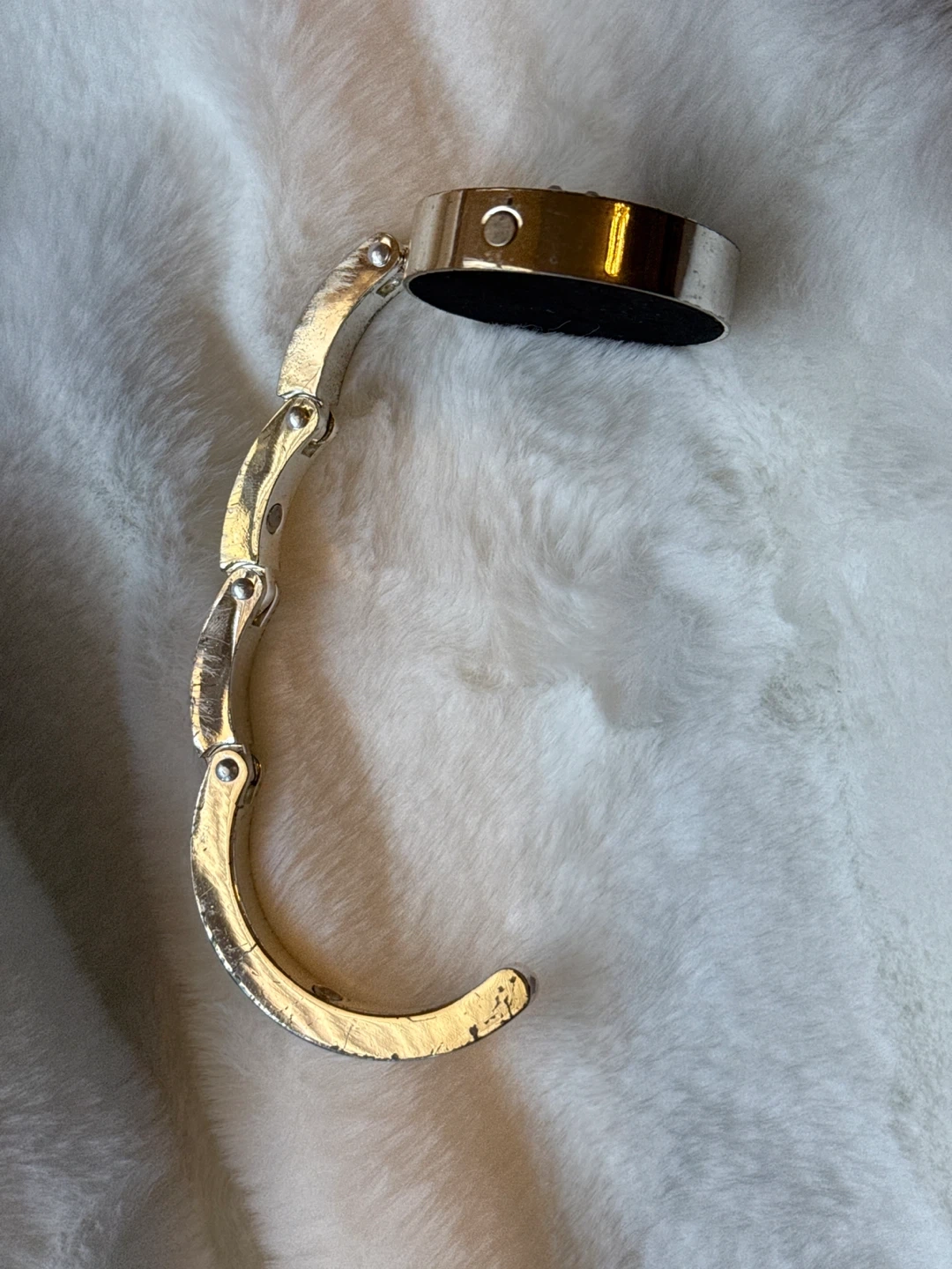 This is a purse hook that can be used to hang your purse on the edge of a table. Rhinestones are intact, just a few scratches but it works like a charm. It's in good condition and ready for a new home!