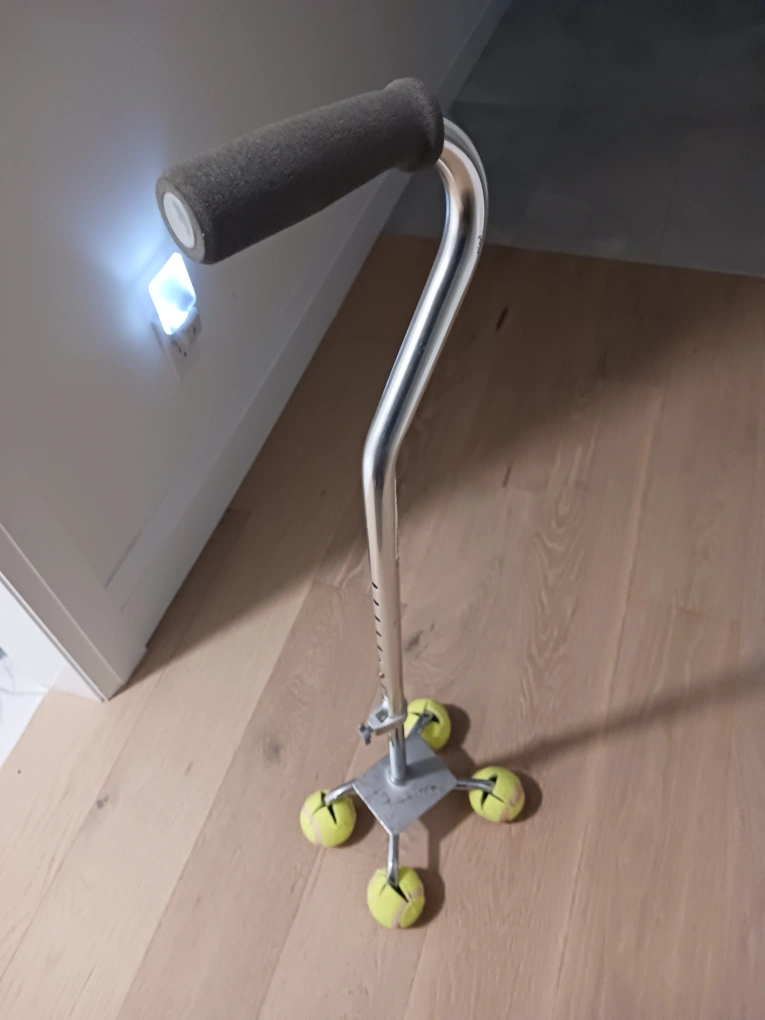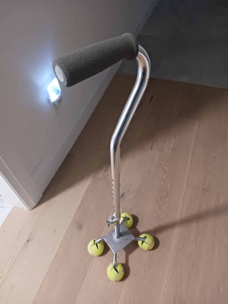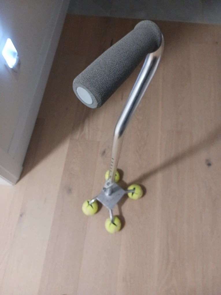 Selling a quad cane walking stick. It has a comfortable grey foam handle and four yellow feet for added stability. This cane is adjustable to suit your height and provide reliable support.