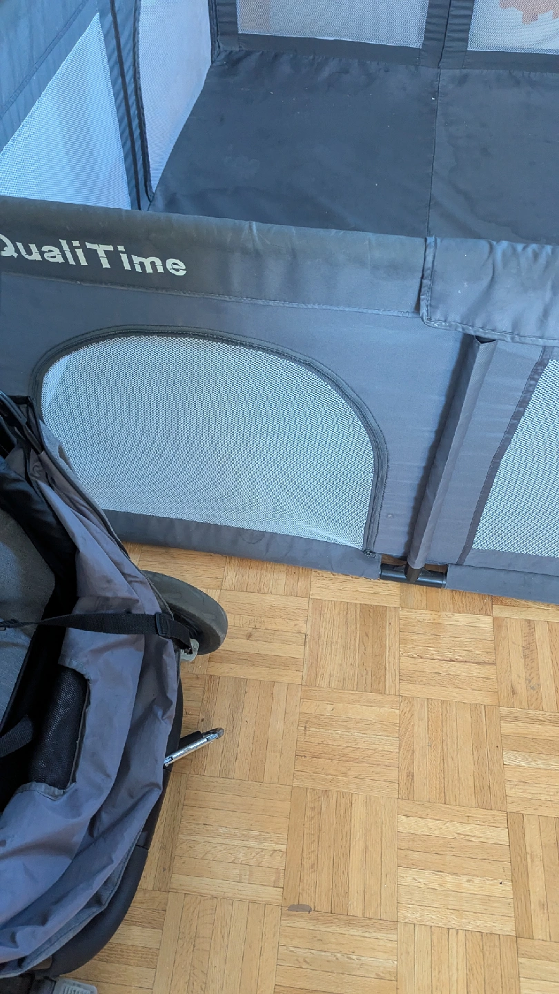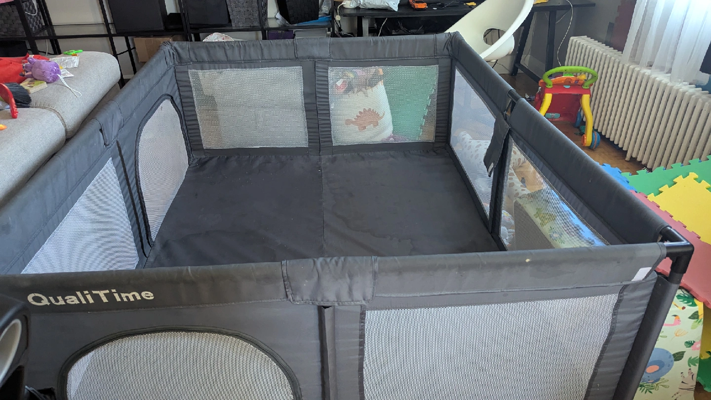 Selling a QualiTime playpen in good condition! It's perfect for keeping your little one safe and contained while giving them space to play. The mesh sides allow for easy visibility and airflow