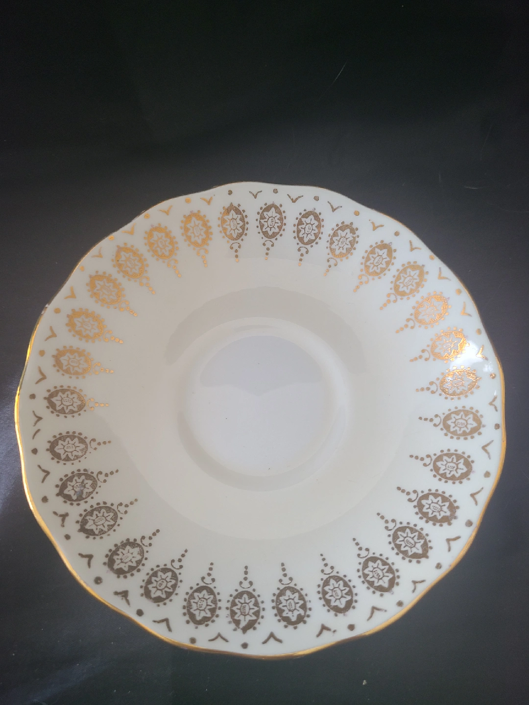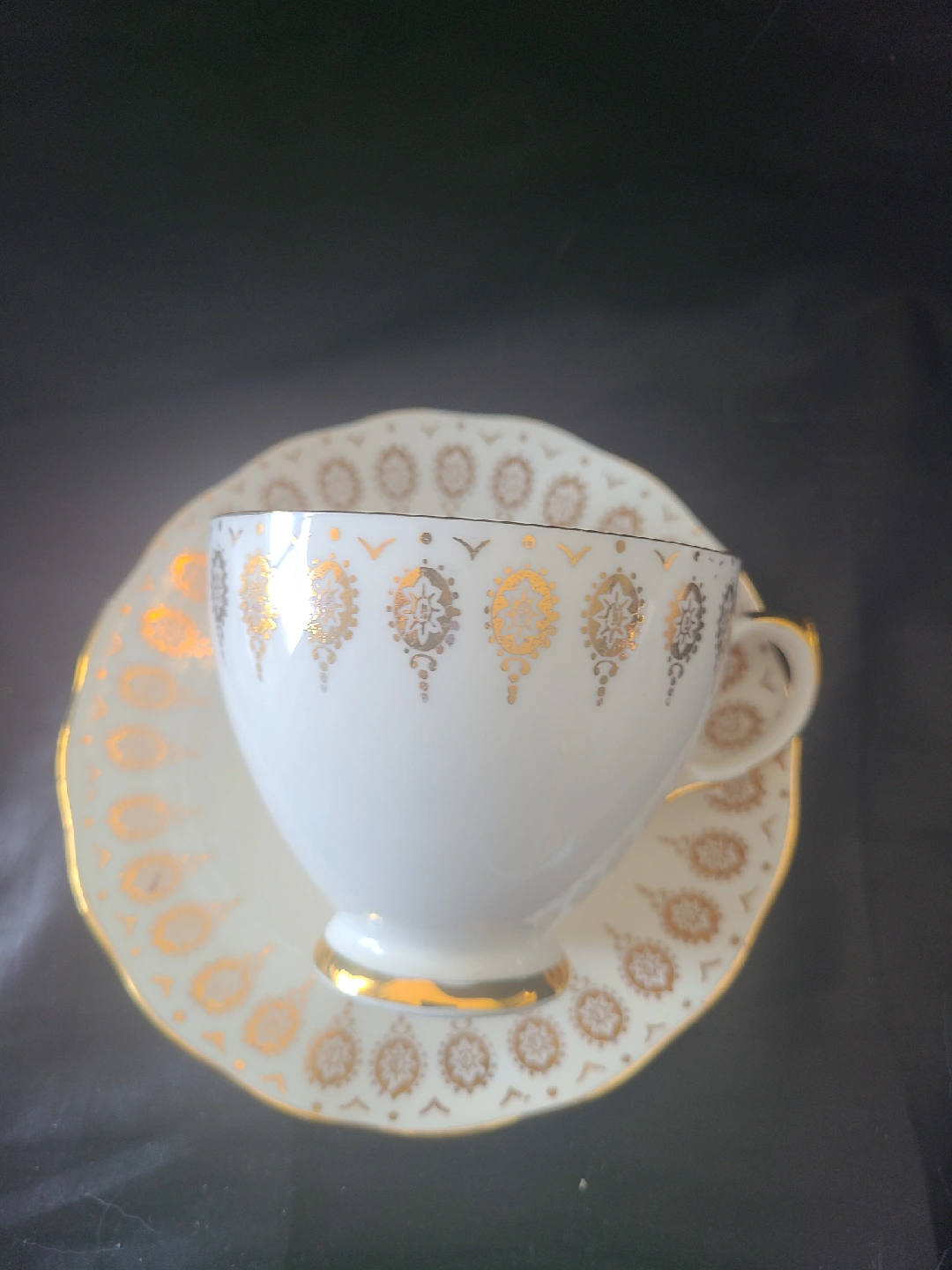 Beautiful Queen Anne bone china tea cup and saucer set! The set is white with gold medallion pattern. Queen Anne Pattern 7934