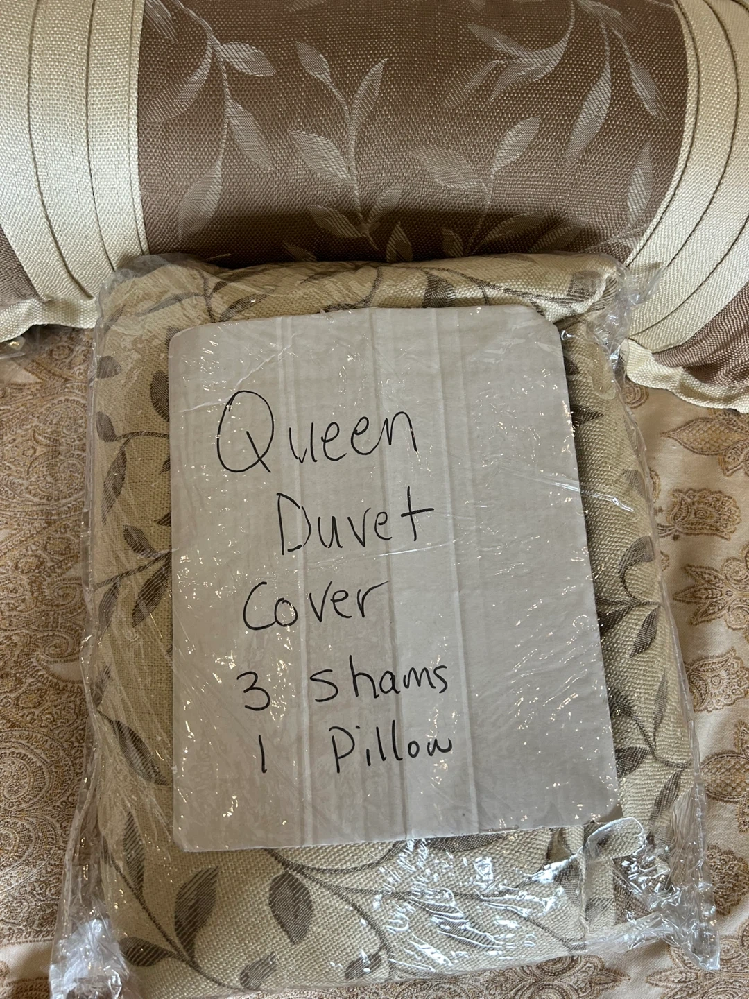 Selling a brand new queen duvet cover set, still in its original packaging! Includes the duvet cover, 3 shams, and 1 pillow. The pattern features a lovely leaf design in neutral tones.