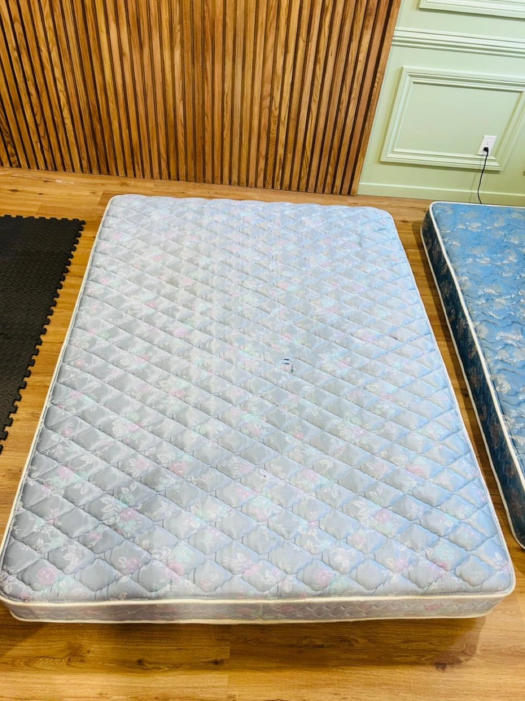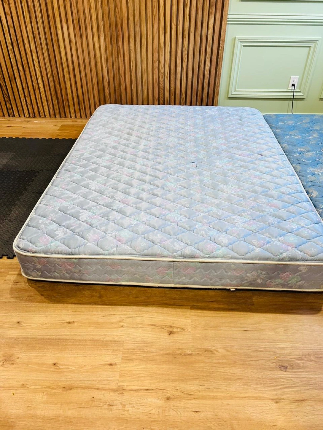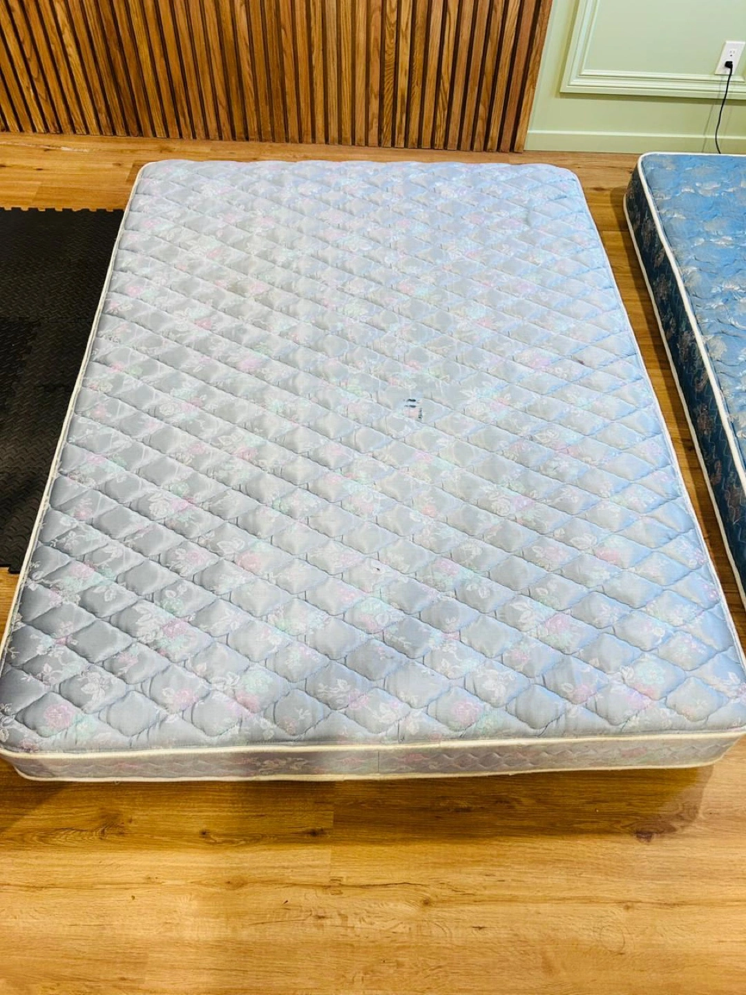 Selling two twin mattresses. One has a light blue quilted pattern, and the other has a darker blue floral pattern. Both are in used condition.