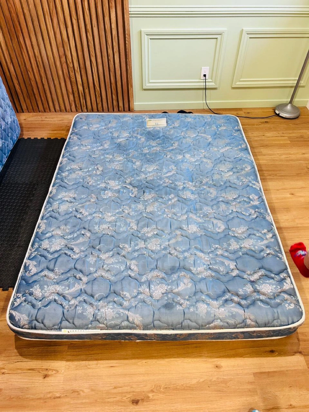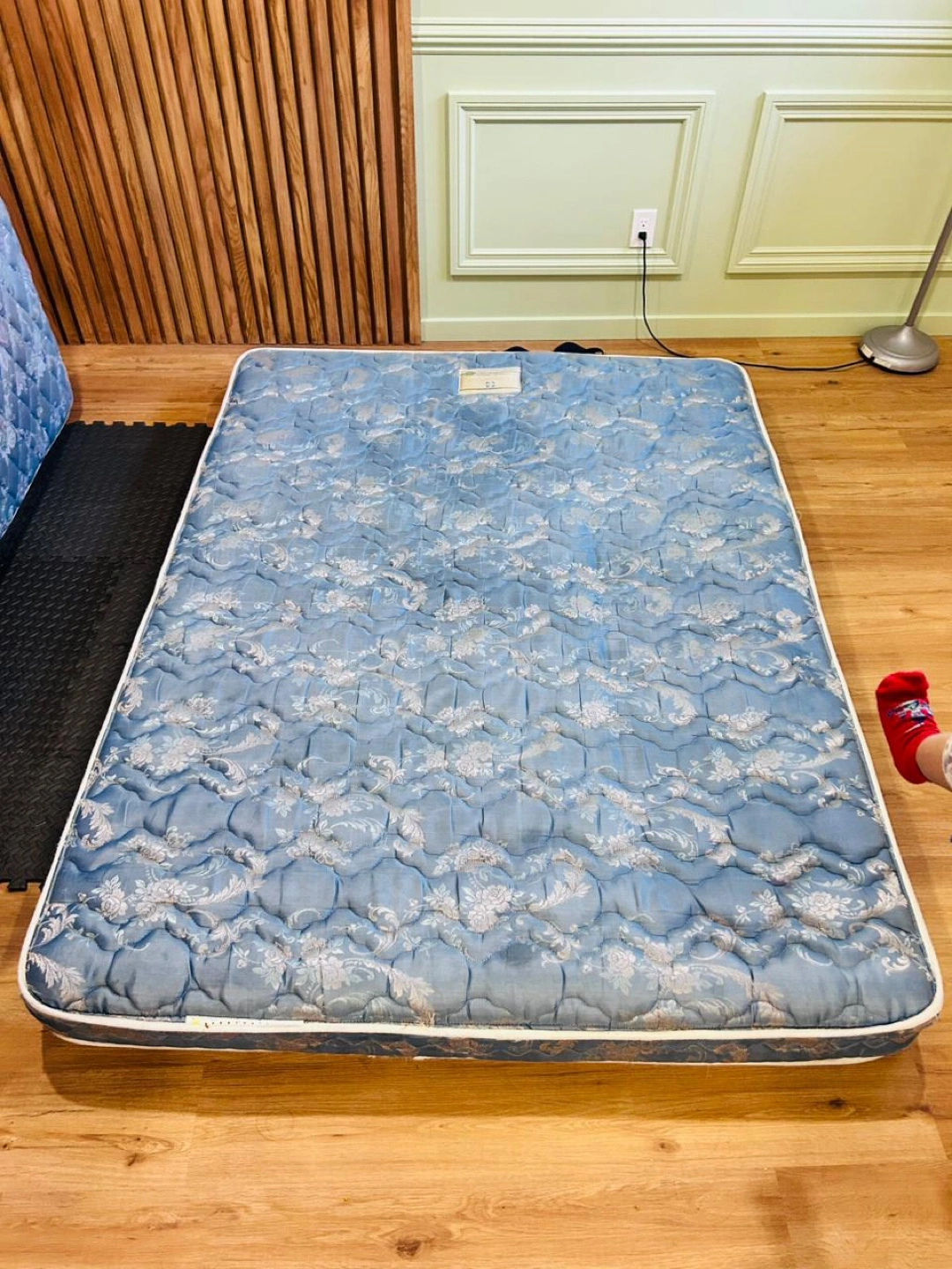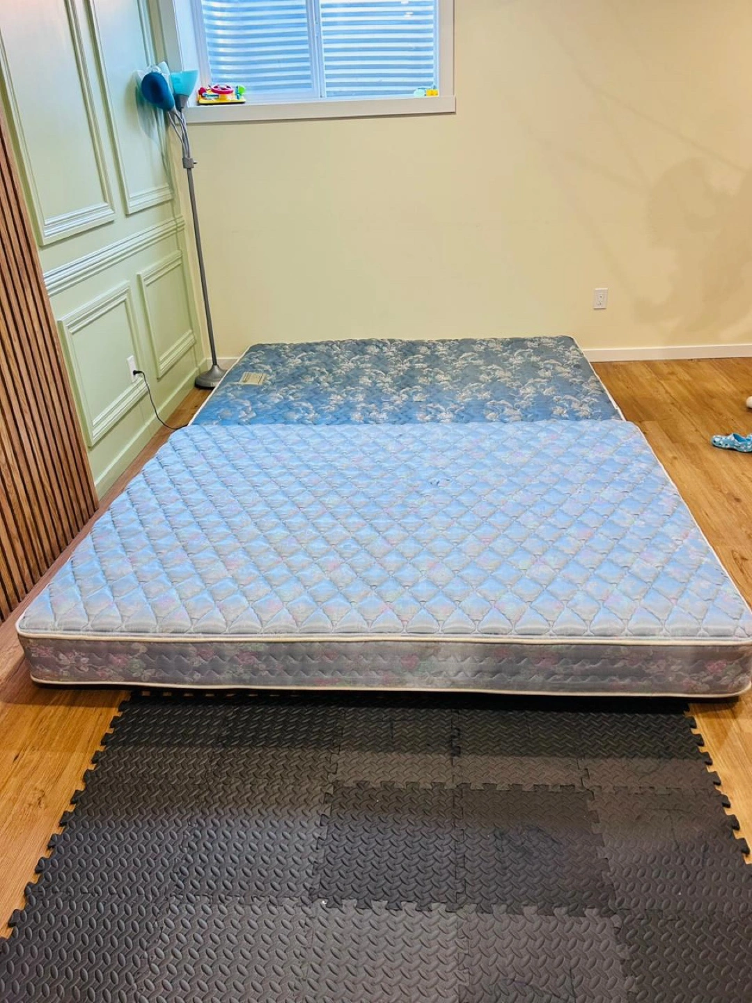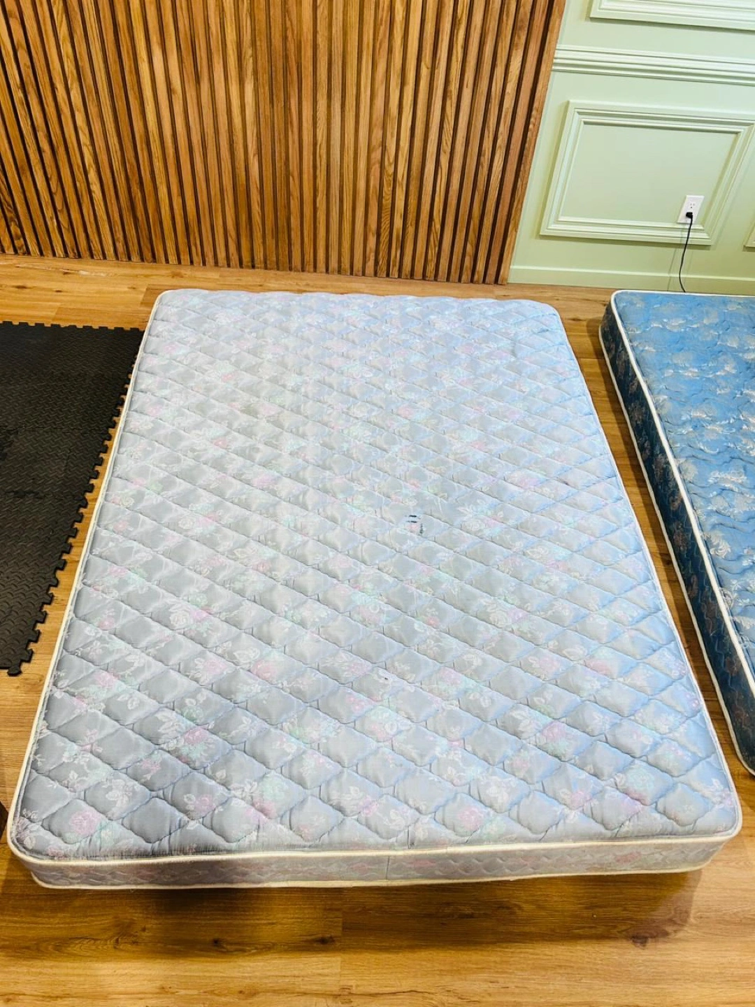 Selling two twin mattresses. One has a light blue quilted pattern, and the other has a darker blue floral pattern. Both are in used condition.
