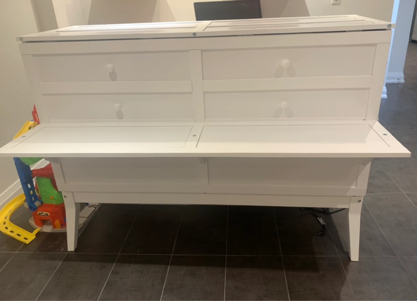 Selling a white desk Queen Murphy bed. It needs to be repaired to use. It is definitely possible to repair it but we have changed the room to be a regular bed vs Murphy so are selling it to a DIY type person. There are outlets on the bed that are in working condition so you can plug in a phone for charging or a C-PAP machine. To fix this item you’d need to reenforce the bottom legs. Original price was $2,500 so probably worth it to someone to repair and use.