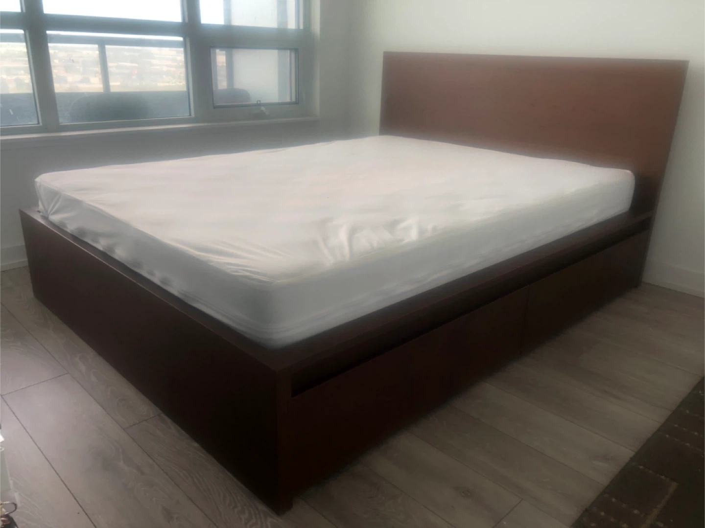 Selling an IKEA queen size bed frame in a lovely brown colour with the matress! It's in great shape and ready for a new home. Perfect for adding a touch of warmth to your bedroom