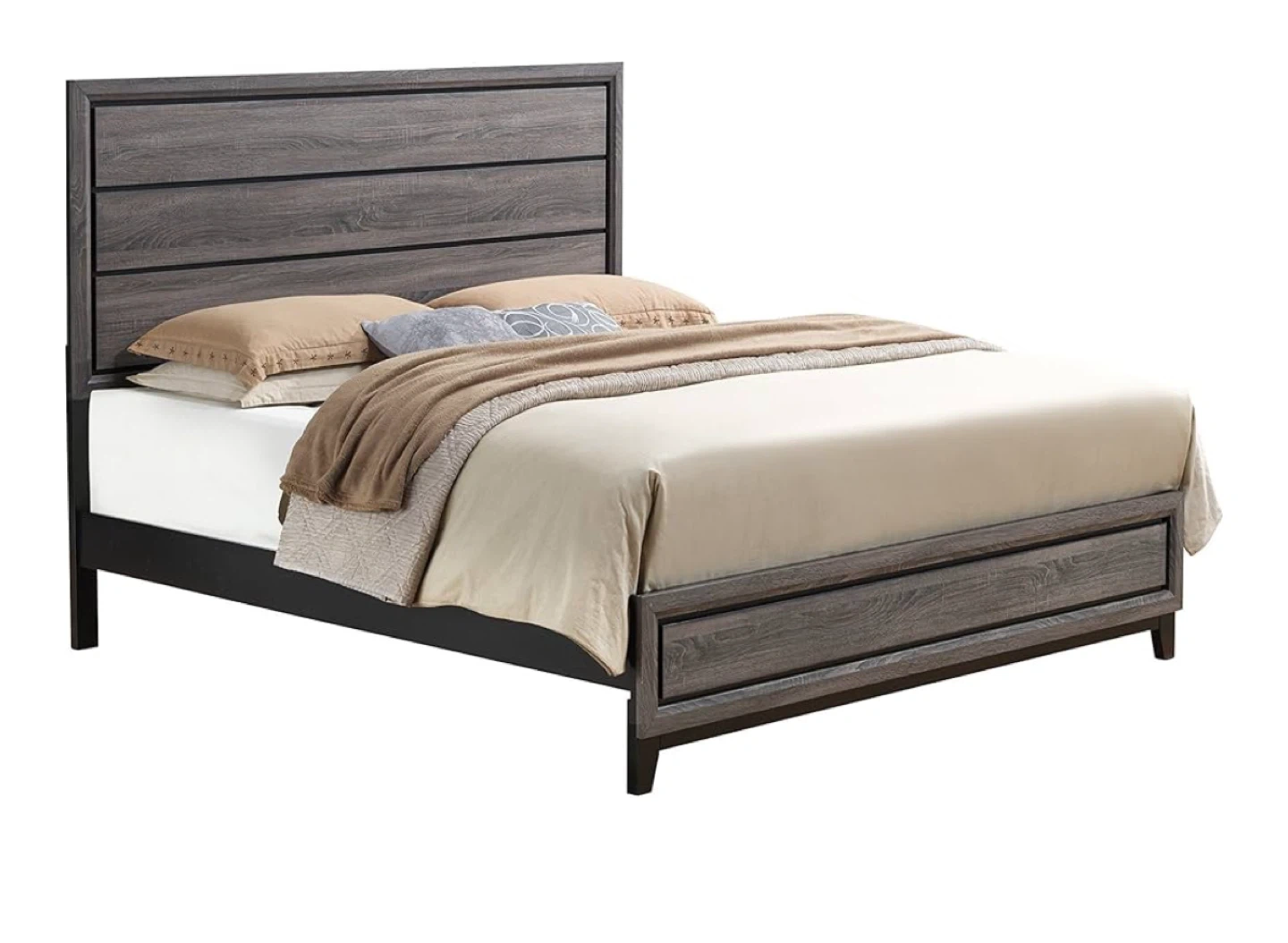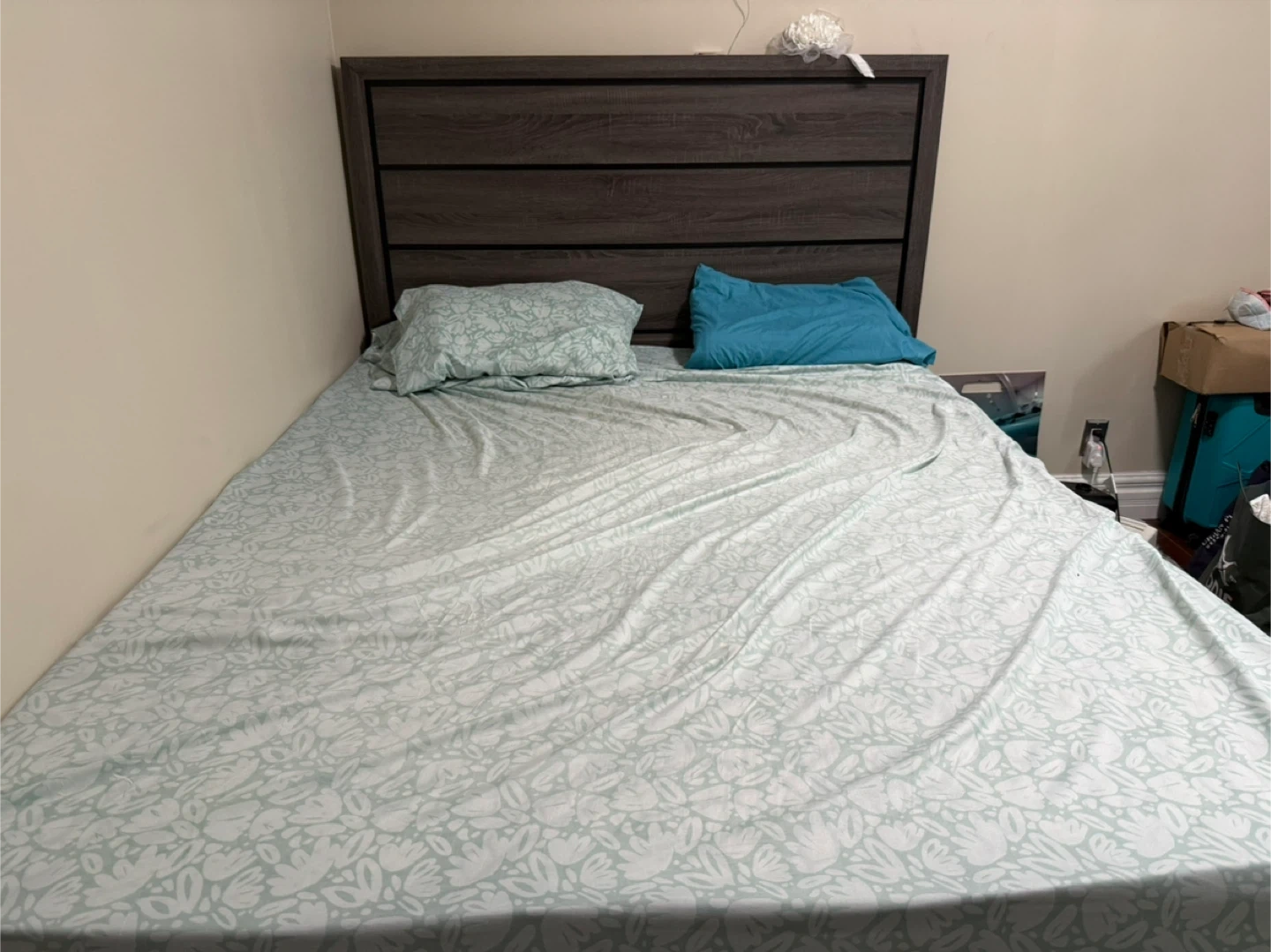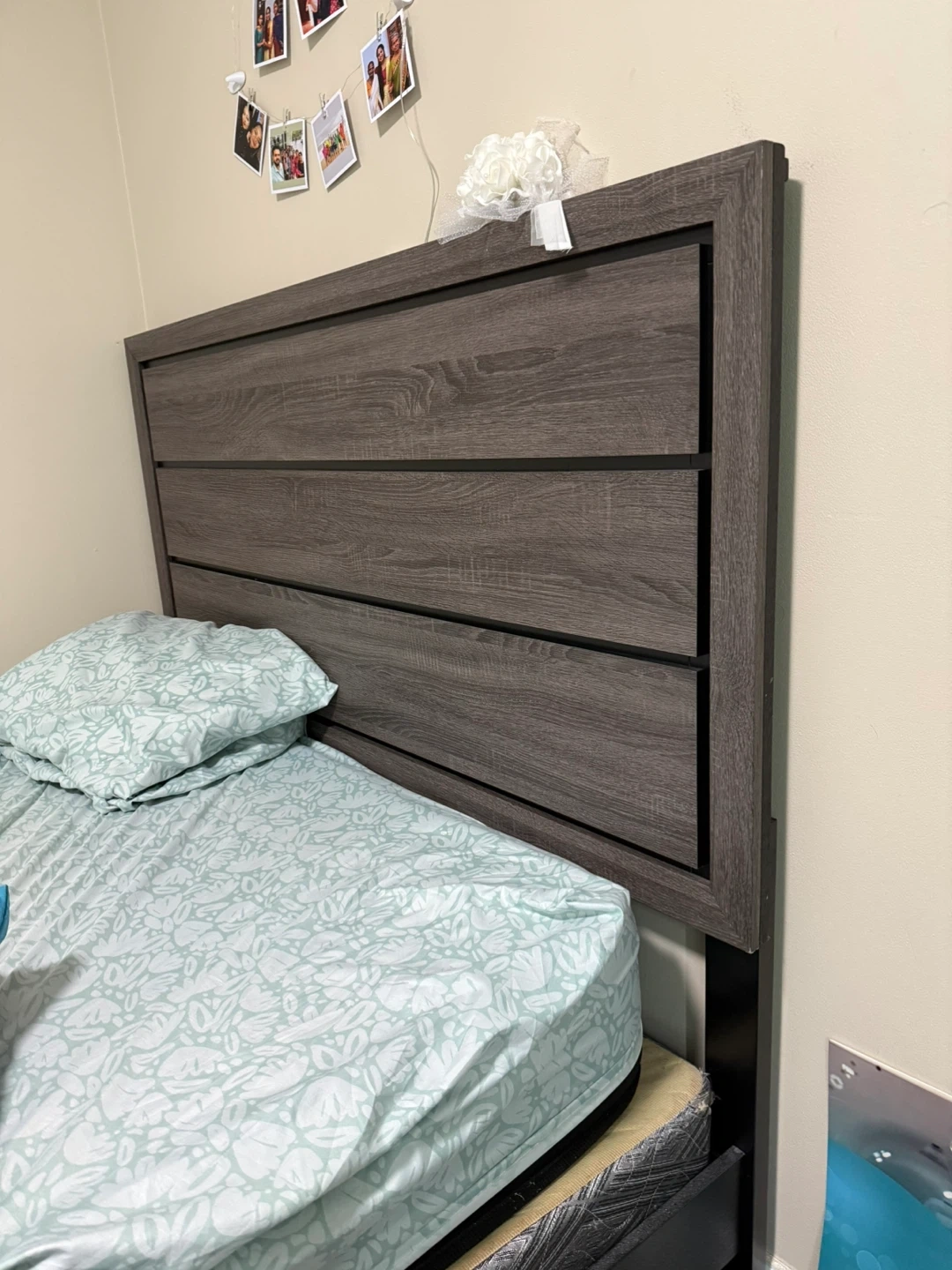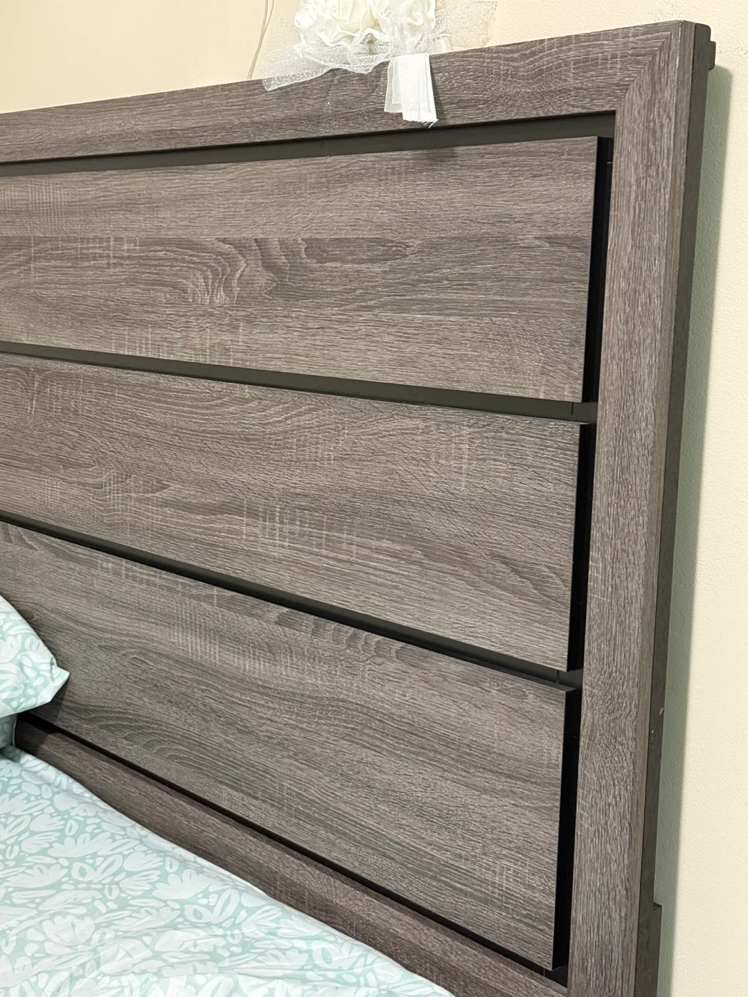 Selling a queen size bed frame with a lovely grey wood finish. It's in great shape and would be a stylish addition to any bedroom! The headboard features a modern design with horizontal panels.
