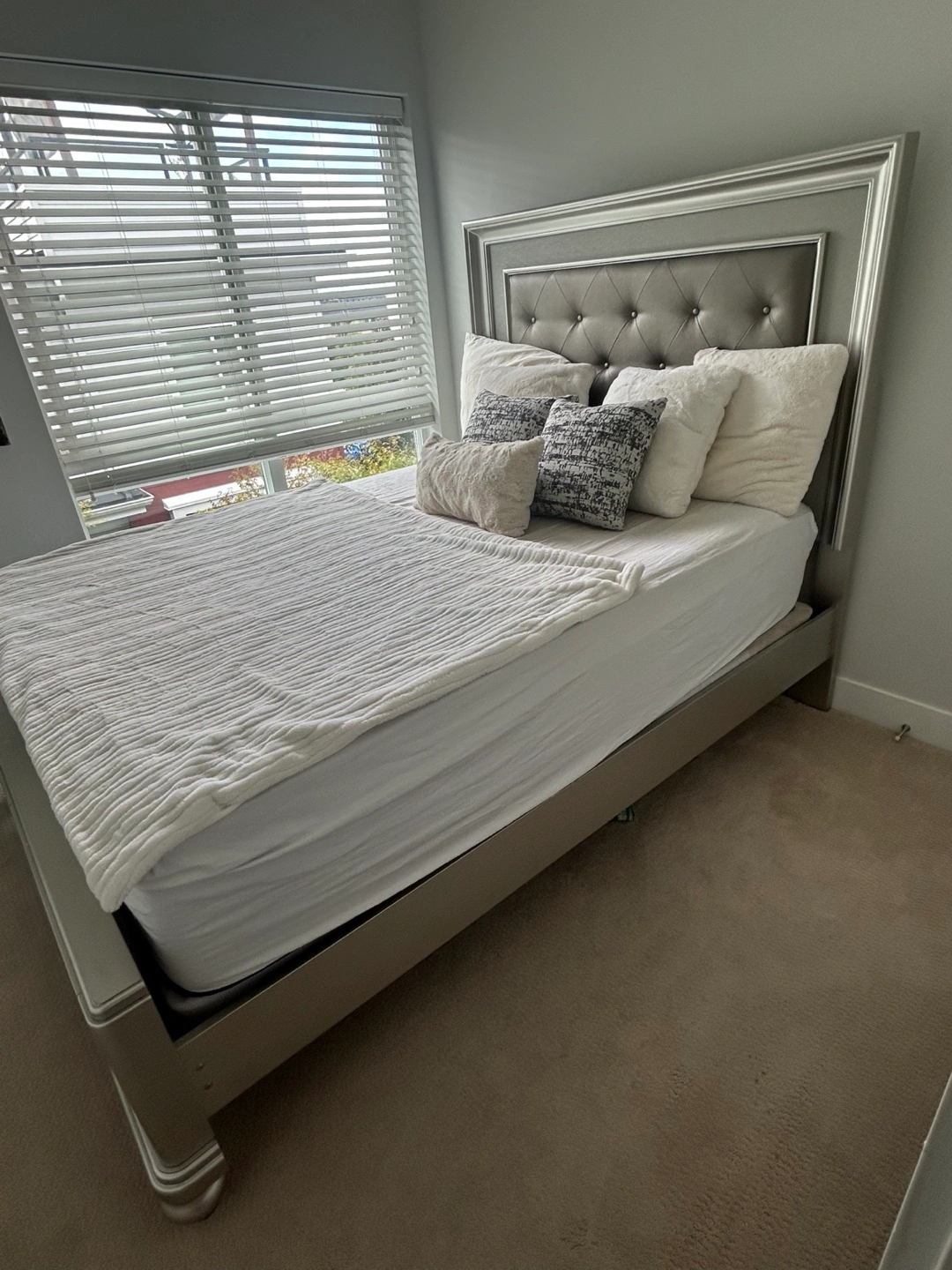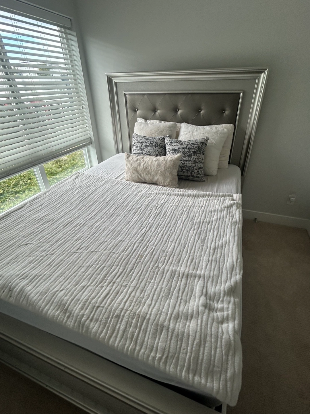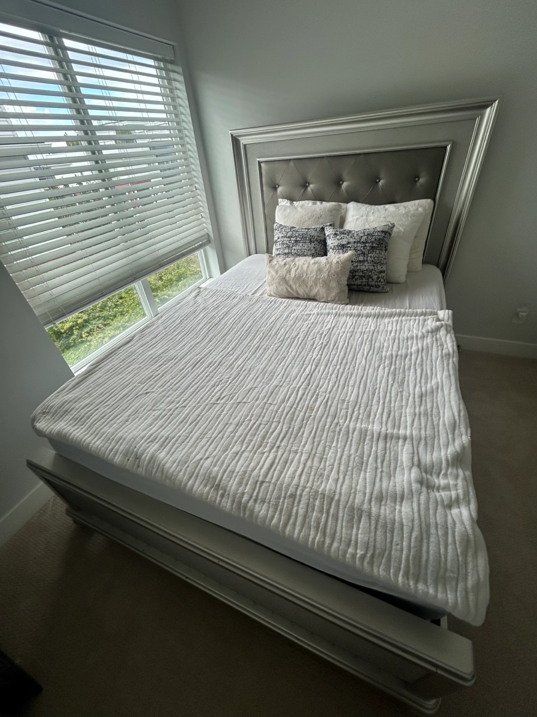 Selling a queen size bed frame with a stylish headboard. It's in great condition and would be a lovely addition to any bedroom. The bed frame is sturdy and the headboard adds a touch of elegance matress alone - $350 bed frame -$450 both - $700