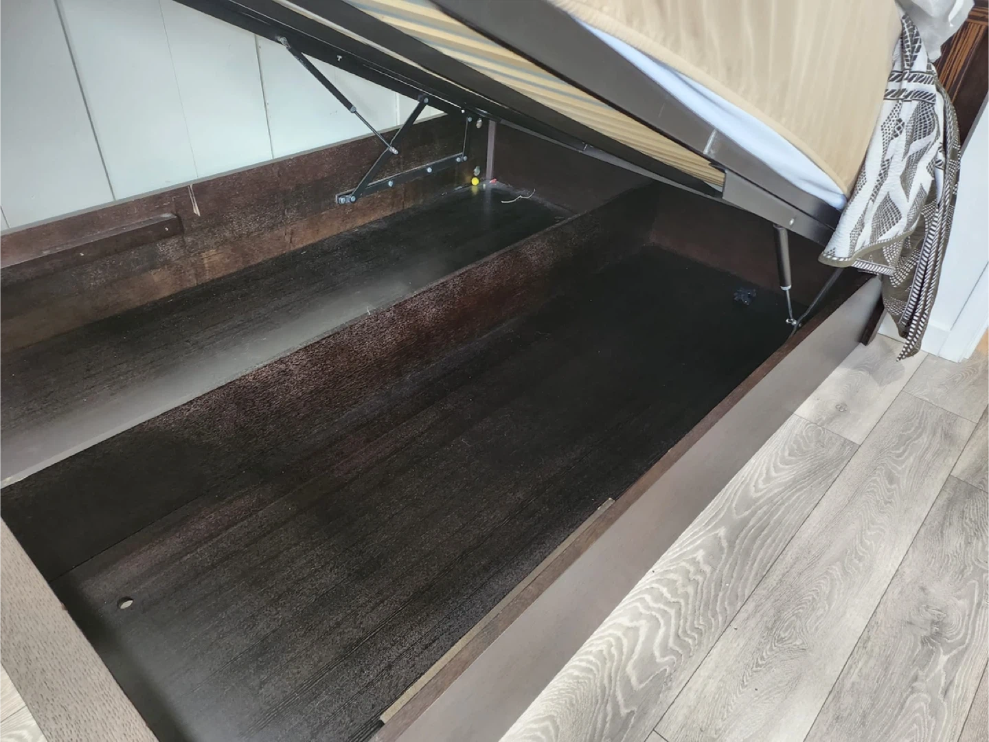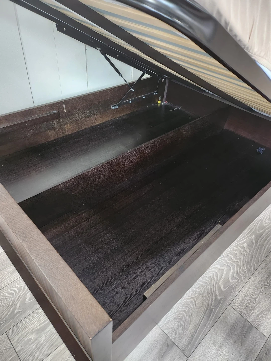Selling a queen size bed with the following features: Hydraulic storage with easy lift-up access for spacious storage Beautiful wooden headboard that adds a stylish touch to any room Bed is in good condition and well-built