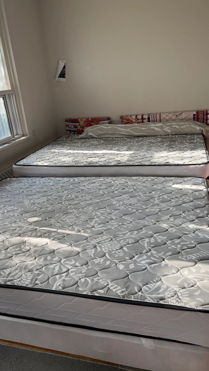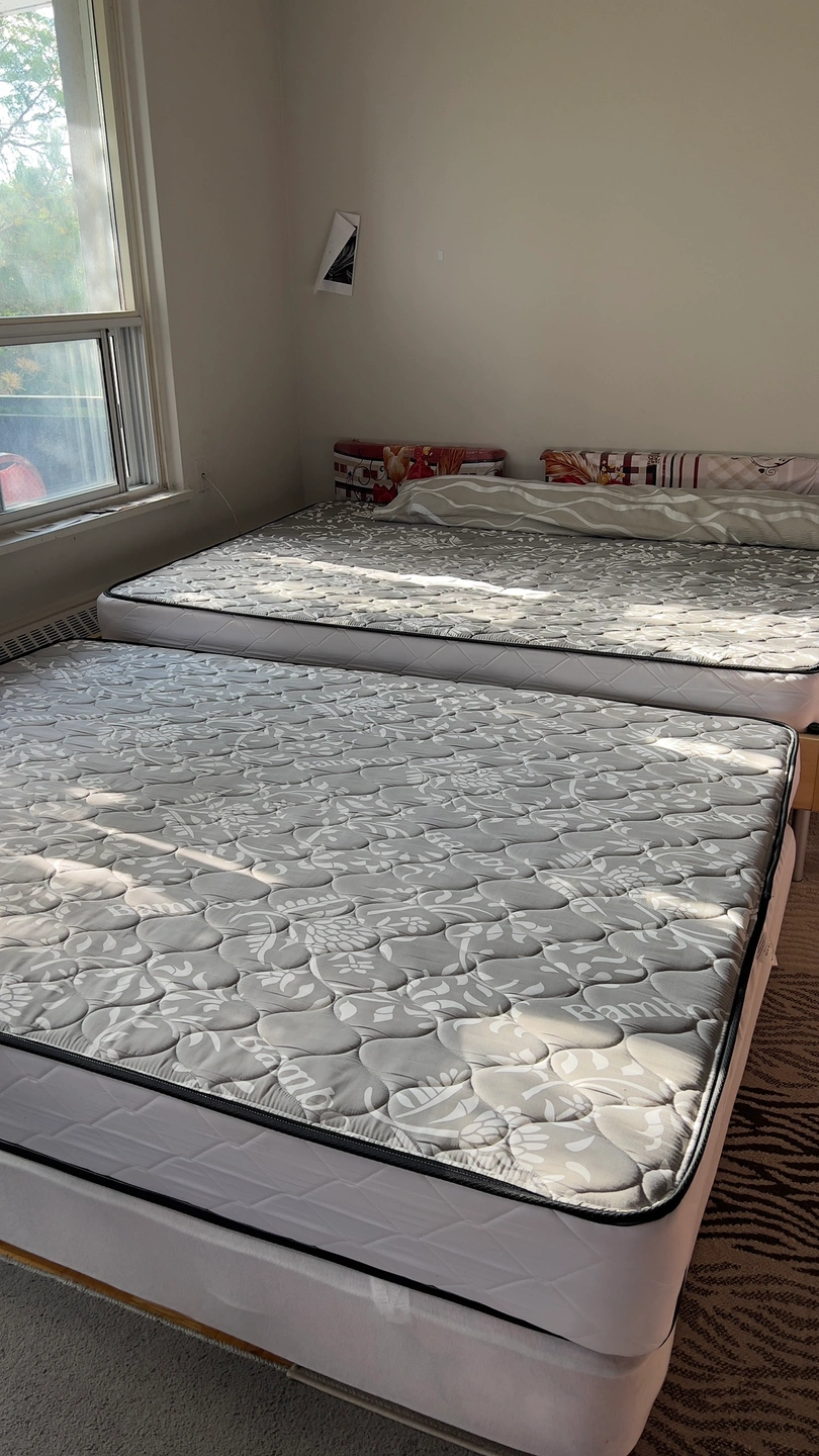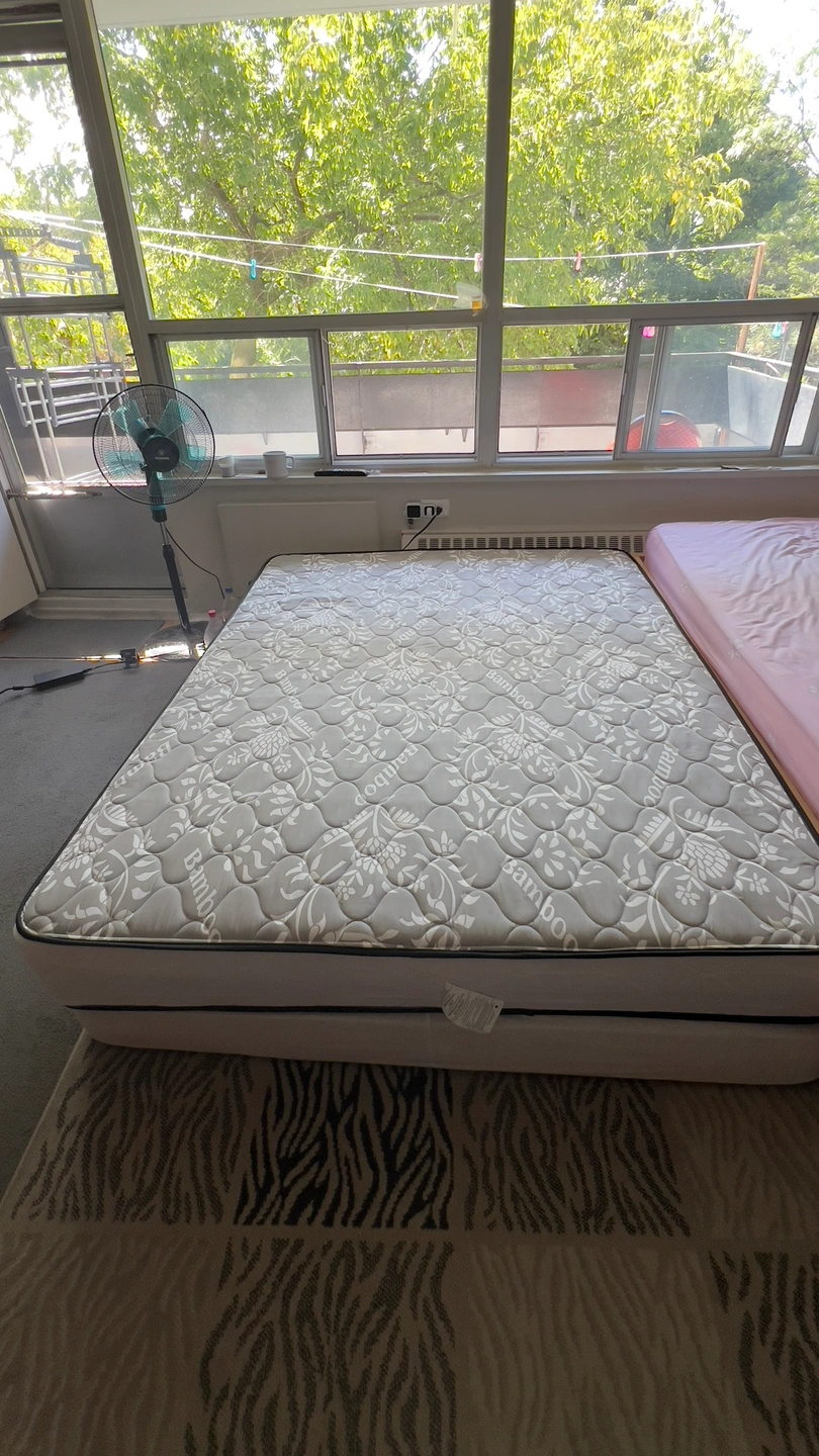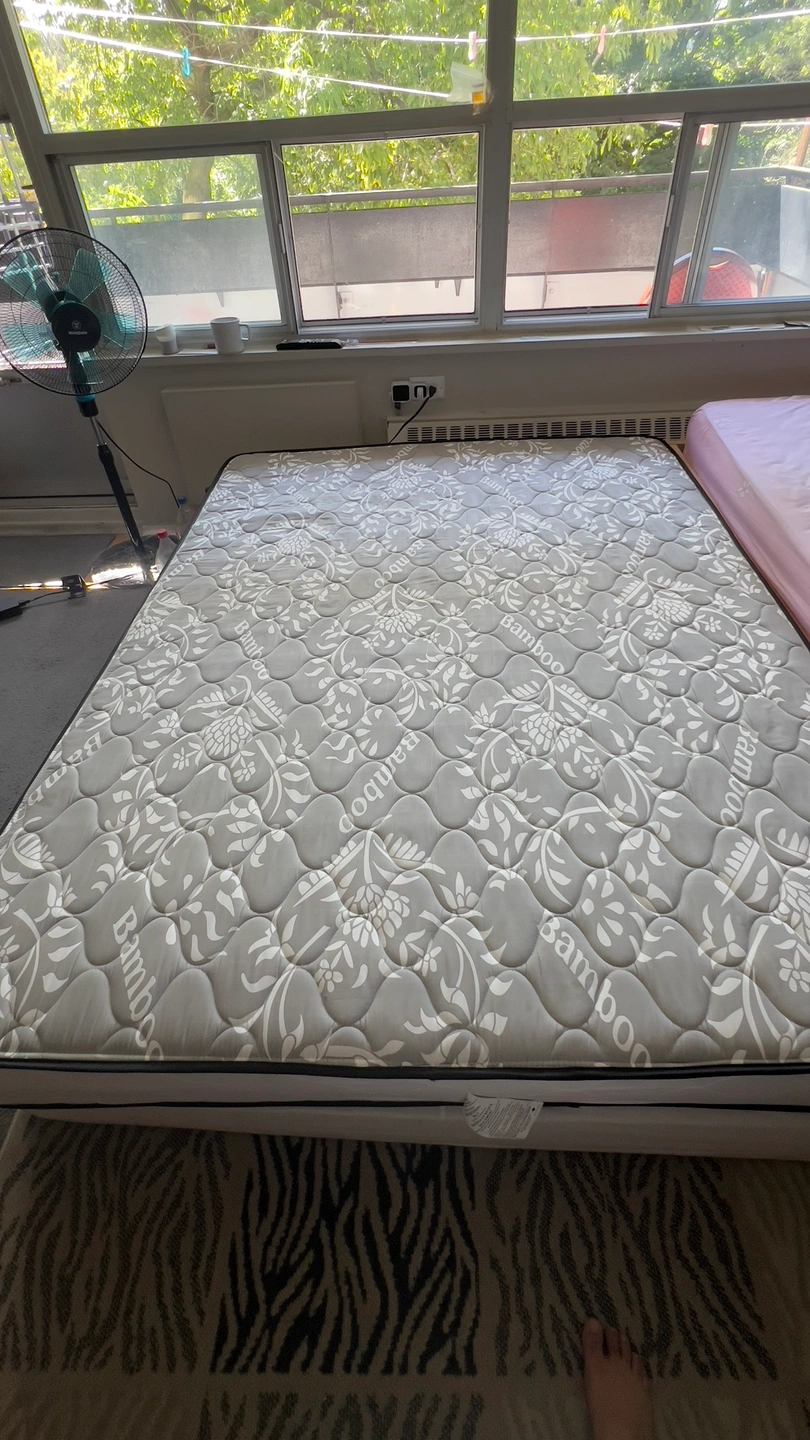 This 1(only one on selling) queen-sized mattress is in good condition. It is a firm mattress, and it is very comfortable. The mattress has a grey fabric cover with a white floral pattern. There are no rips or tears in the cover, and it is free of stains. Will give with white anti bug mattress cover. Kept in Anti Bug cover since Beginning Will give Free Cover too. Wrapped up nicely in plastic ready to Pick Up.