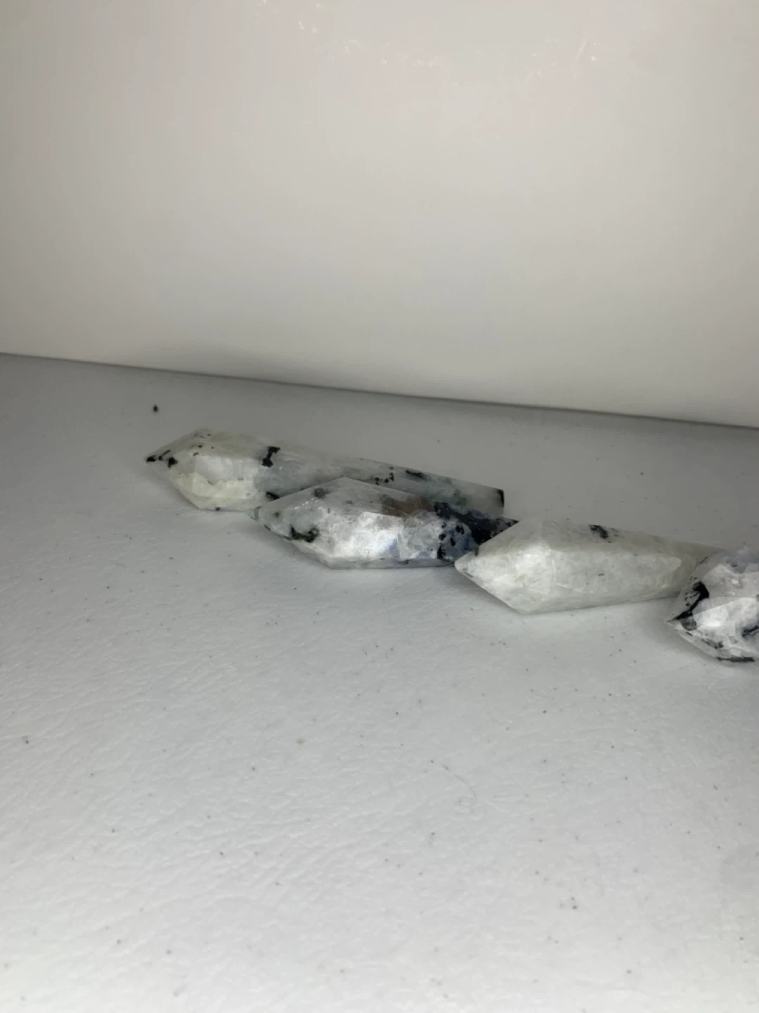 Selling a rainbow moonstone crystal point. These crystals are known for their beautiful iridescence and are believed to promote inner peace and balance. They're perfect for meditation, energy work, or simply as a decorative piece in your home