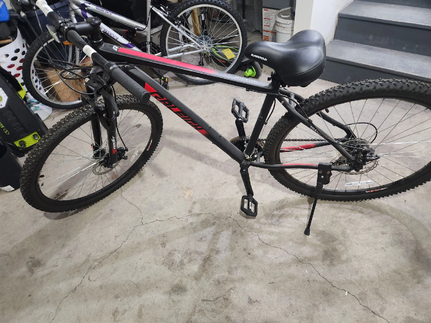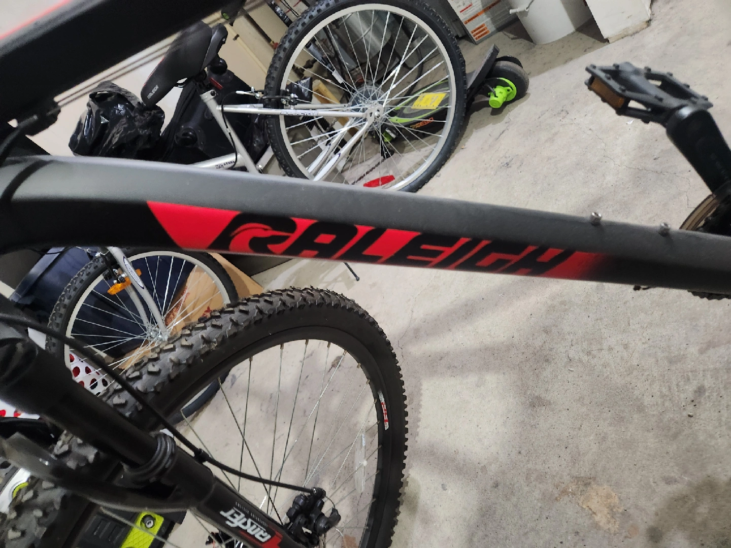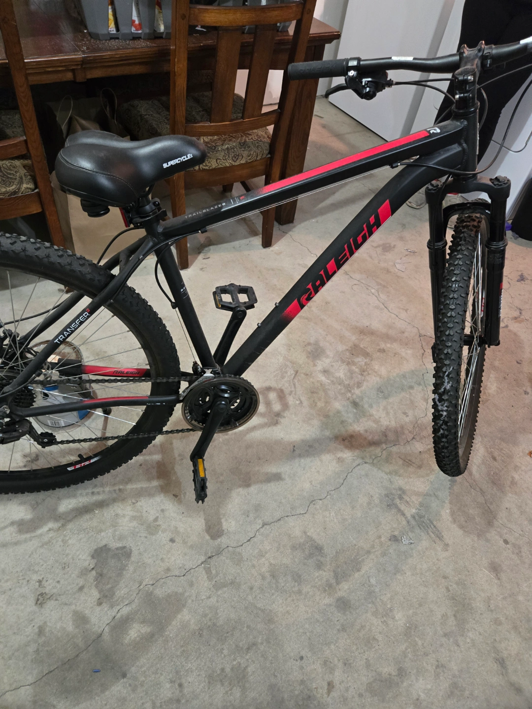 21 speed 29 inch Raleigh trail bike with pump n lock n air ride seat Disc brakes tires are easy to come off