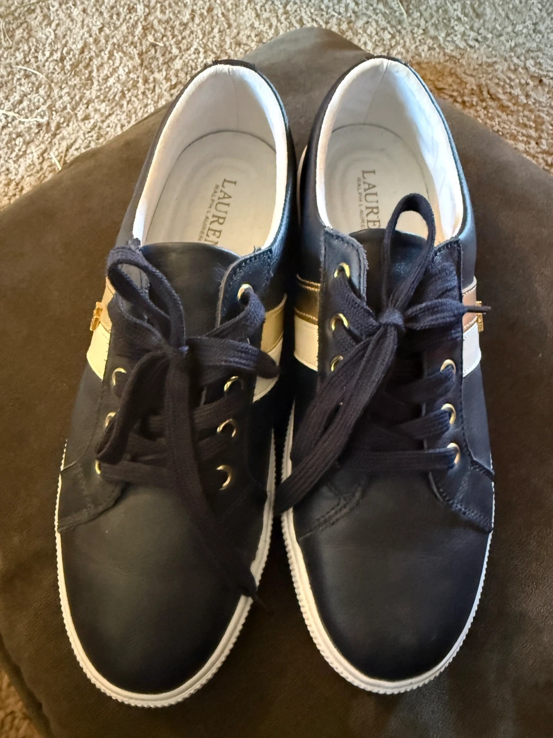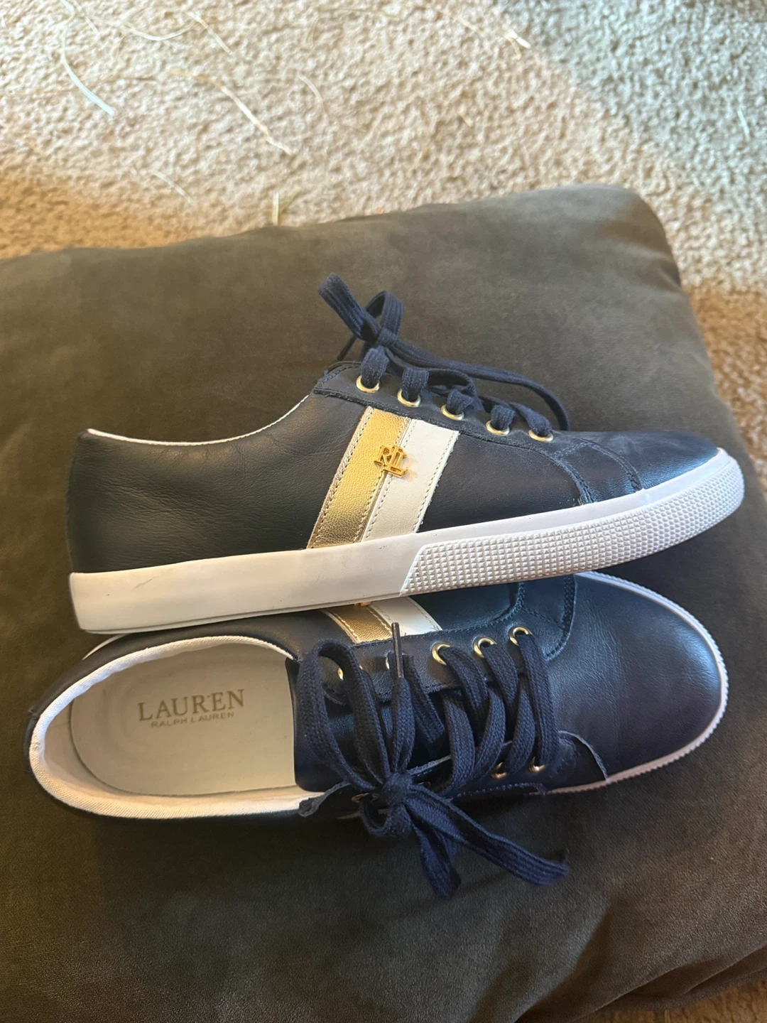 Selling a pair of Ralph Lauren sneakers in navy leather. They are in great condition and a size 9 Perfect for everyday wear!