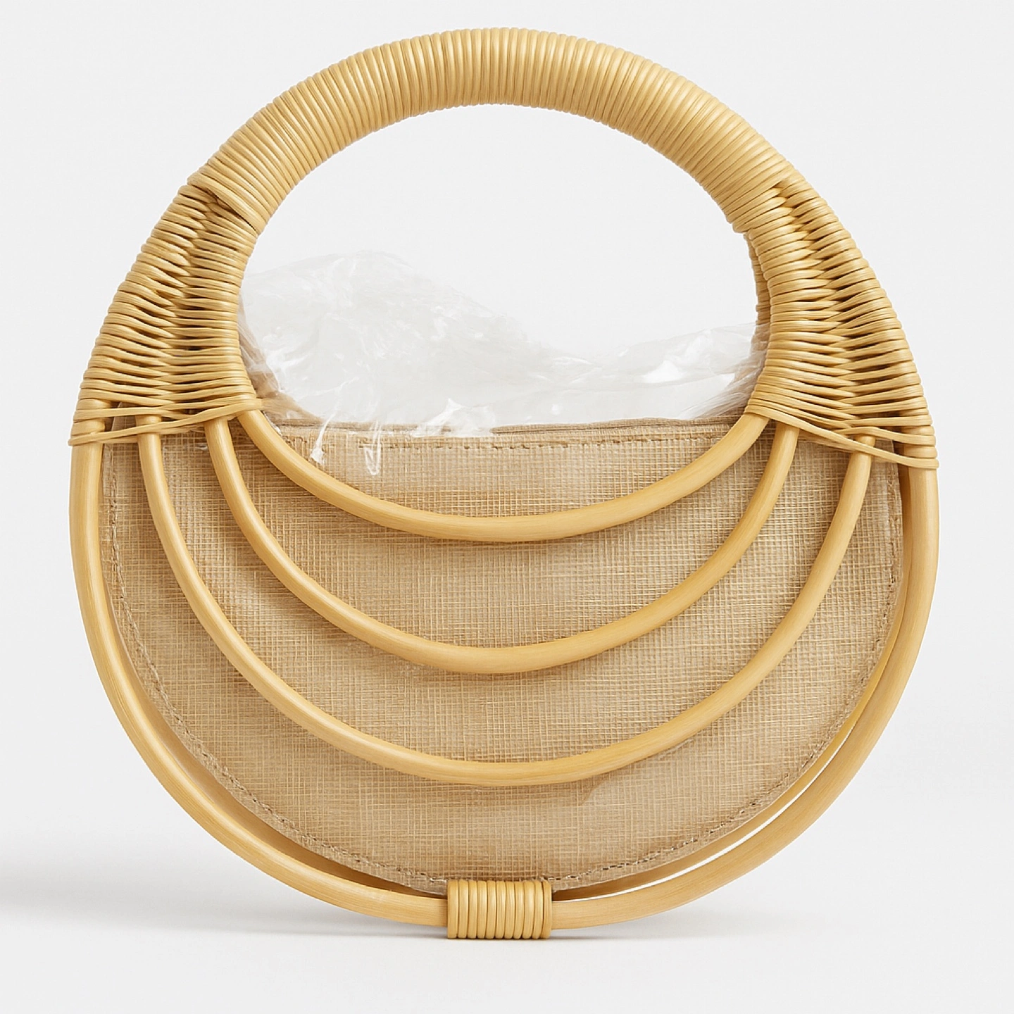 This stylish rattan bag features a unique circle handle design. It's in great condition and ready for a new home! The neutral colour makes it super versatile for any outfit. Perfect for adding a touch of natural texture to your look