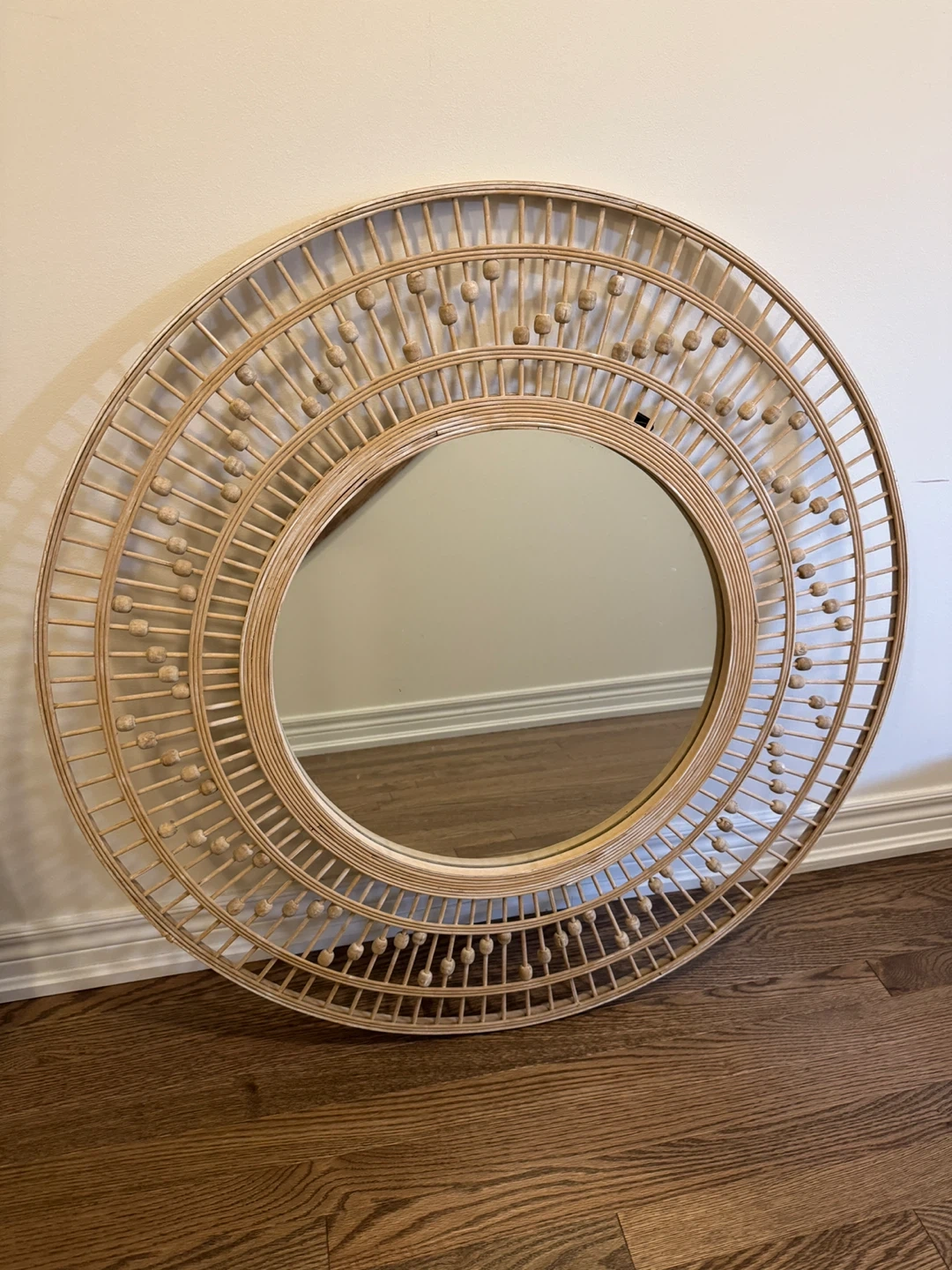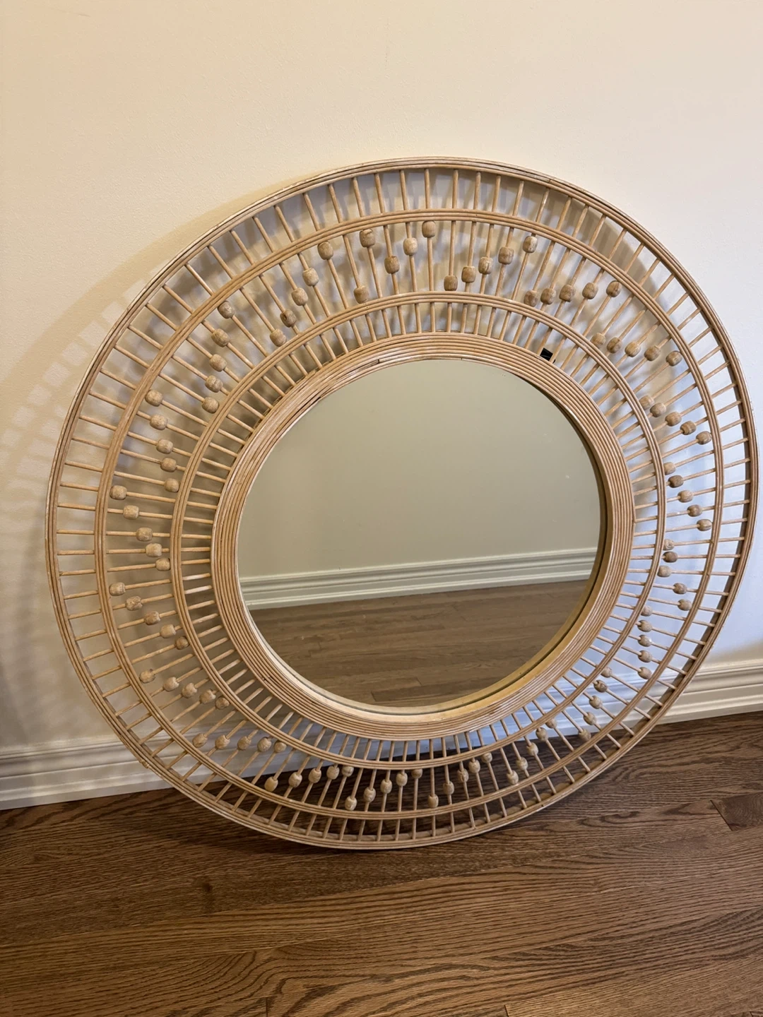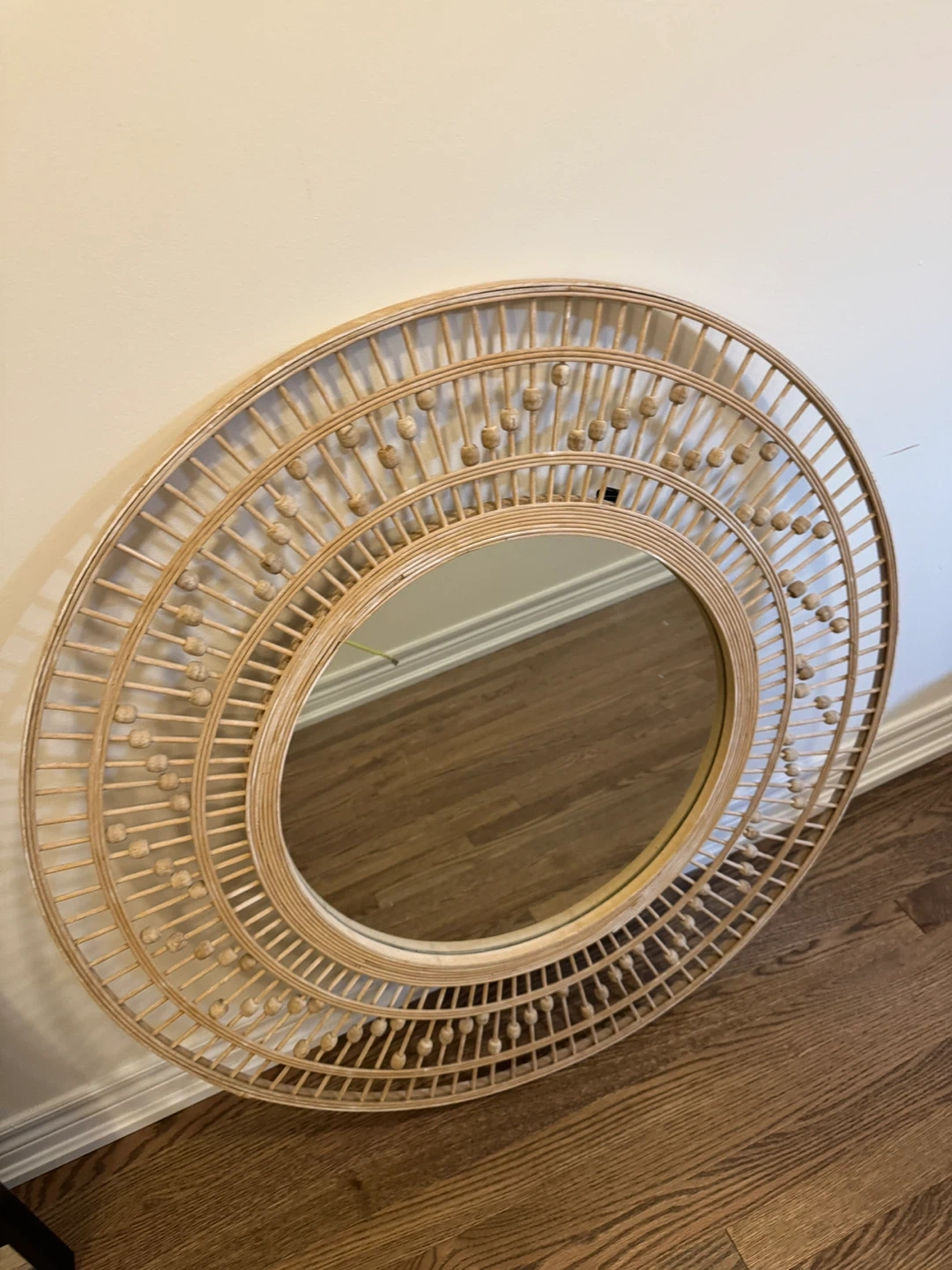 Selling a lovely rattan framed round mirror! It measures approximately 38 inches in diameter. It would be a great addition to any room!