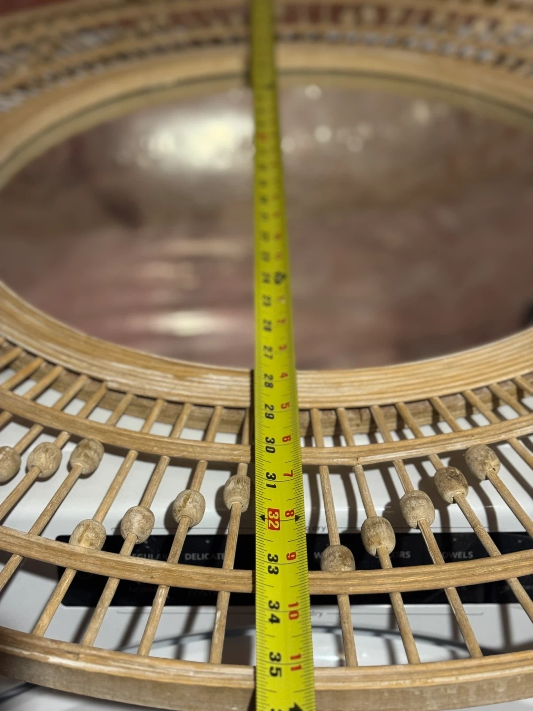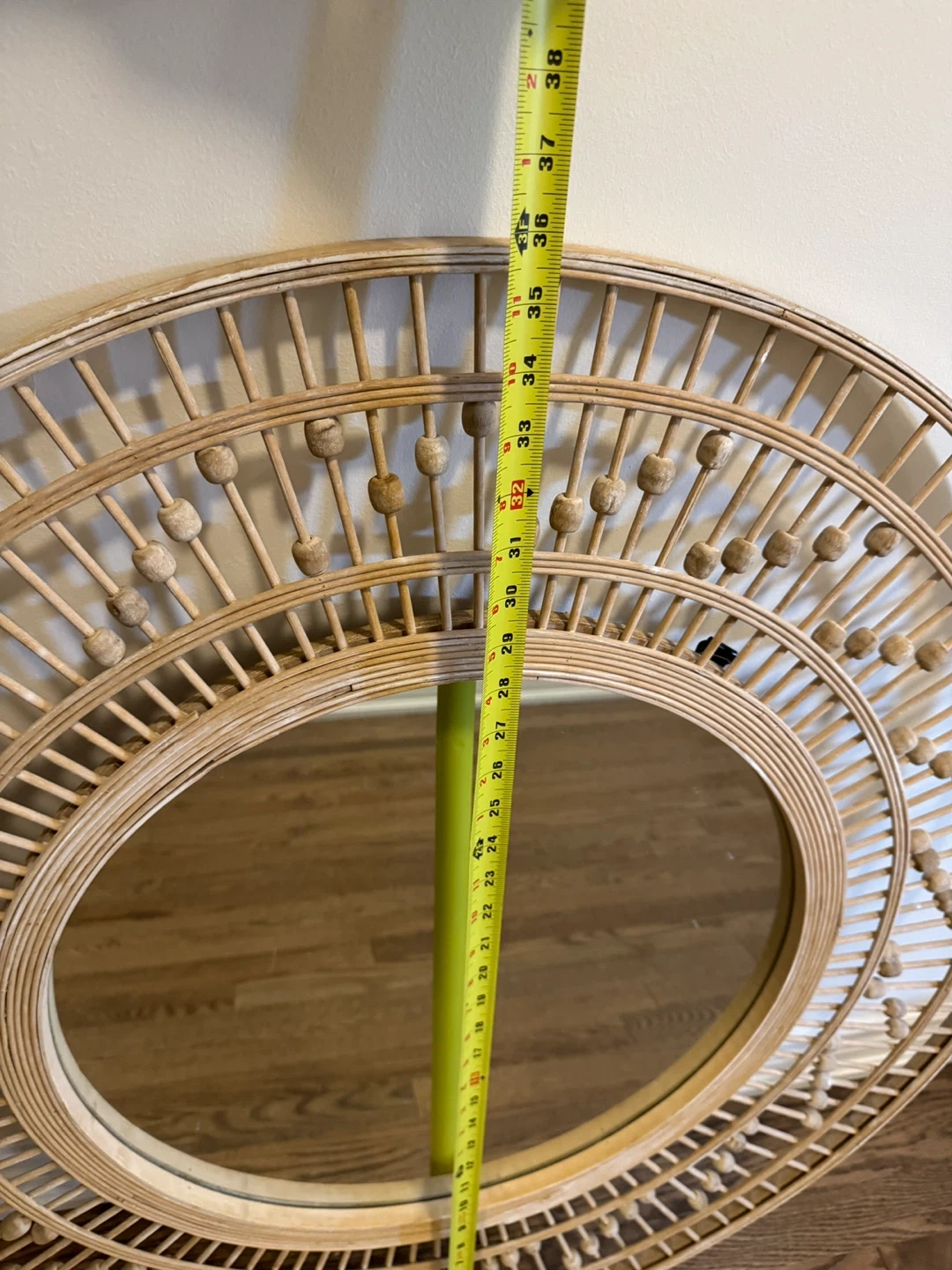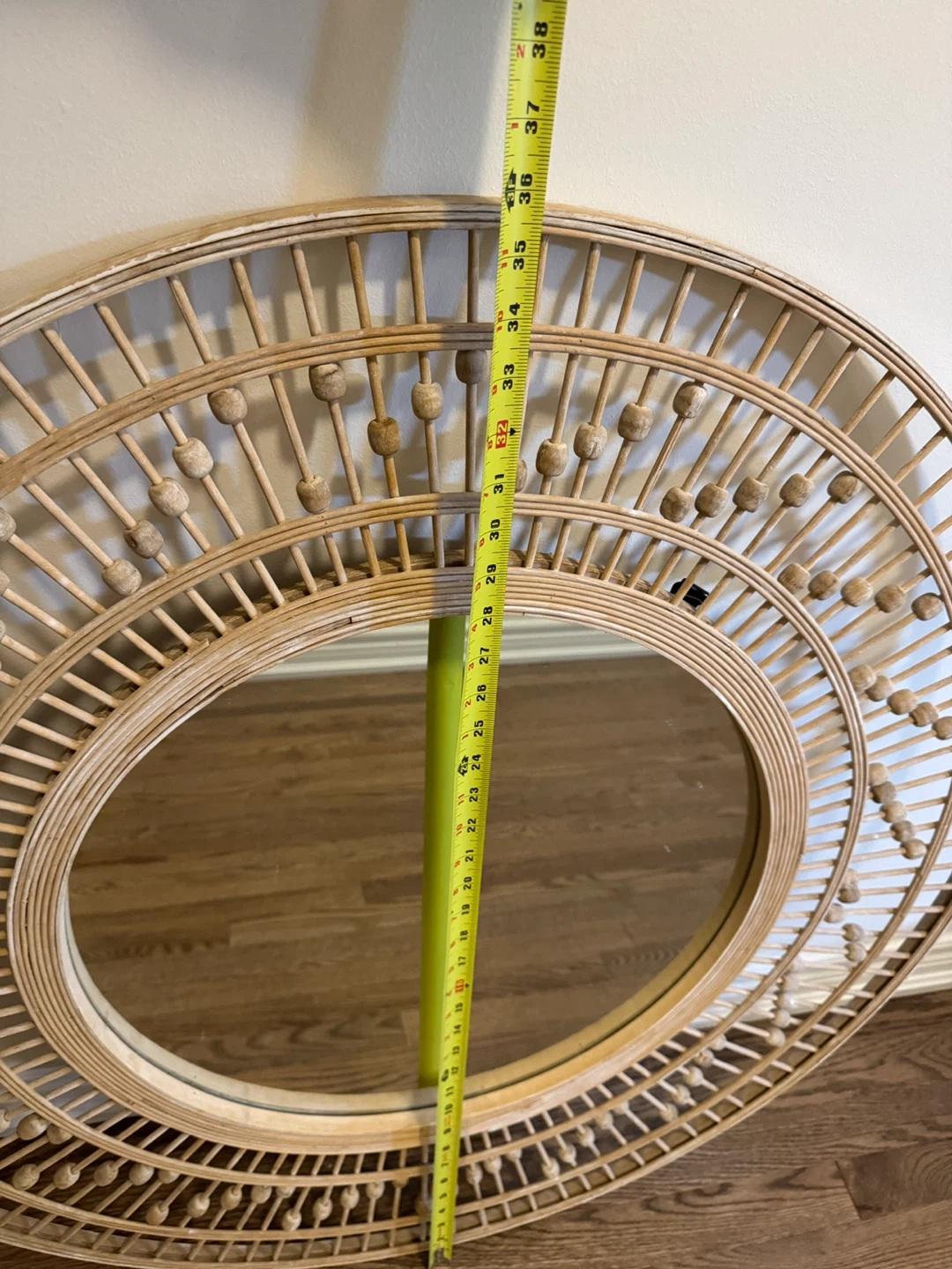 Selling a lovely rattan framed round mirror! It measures approximately 38 inches in diameter. It would be a great addition to any room!