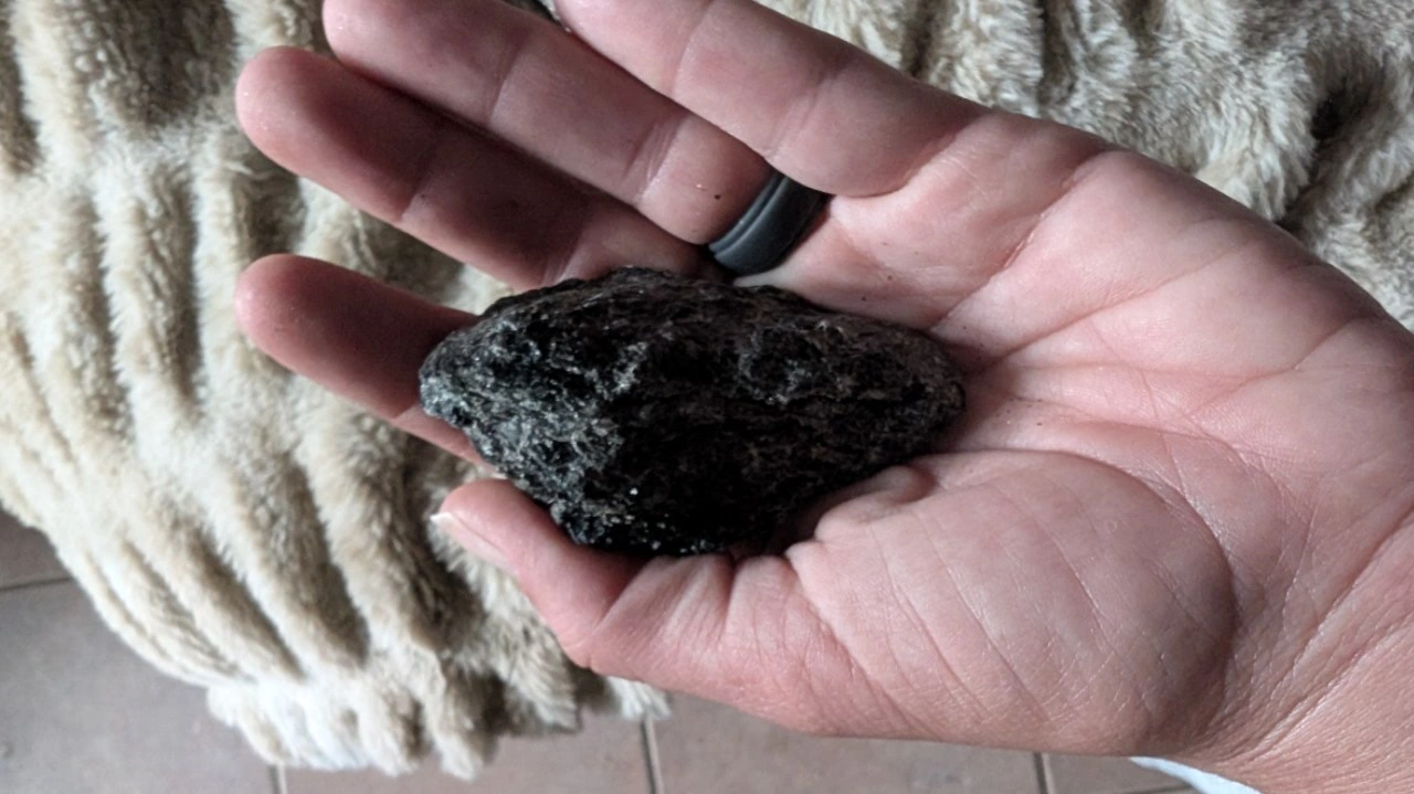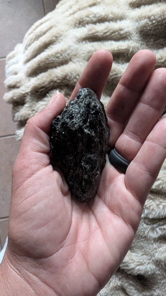 Large raw black tourmaline with pink feldspar and pink quartz.