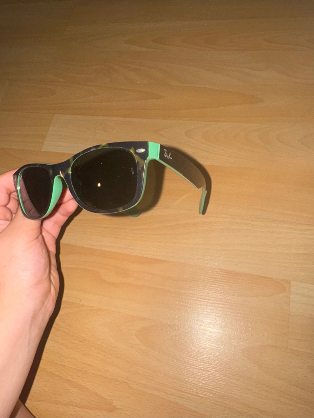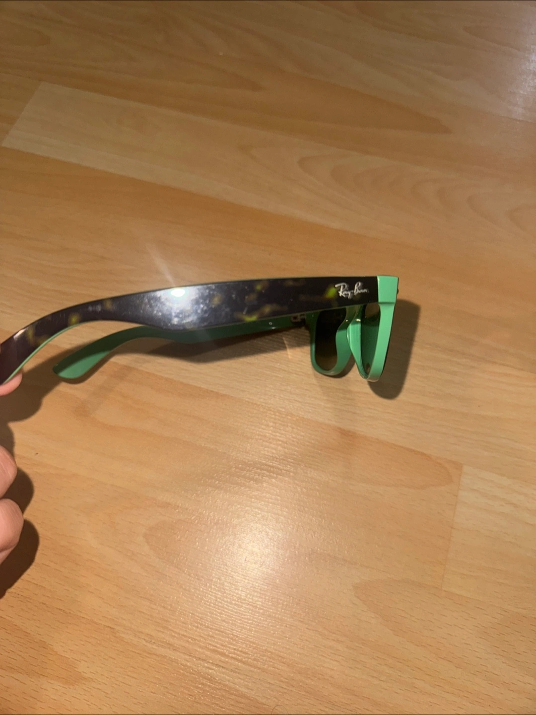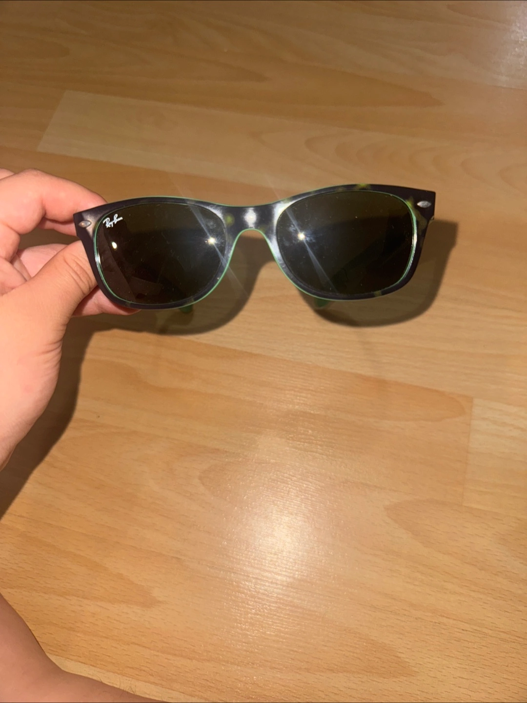 Selling a pair of Ray-Ban Wayfarer sunglasses. They're in great shape and ready for a new home! The frame has a unique pattern with green accents.