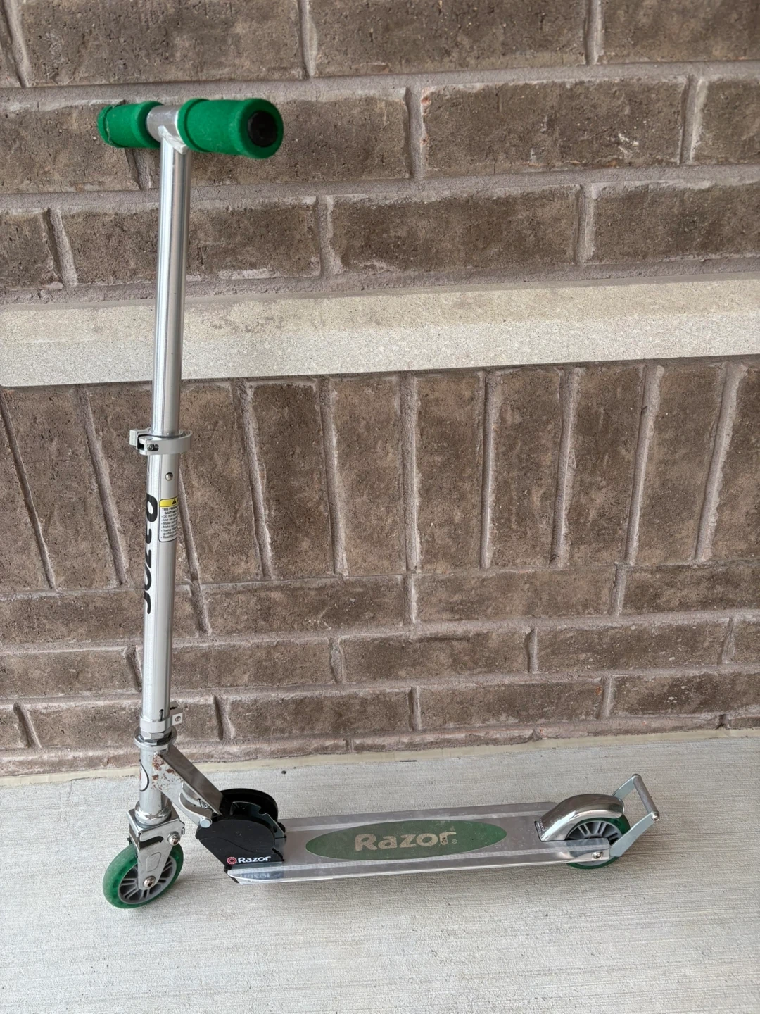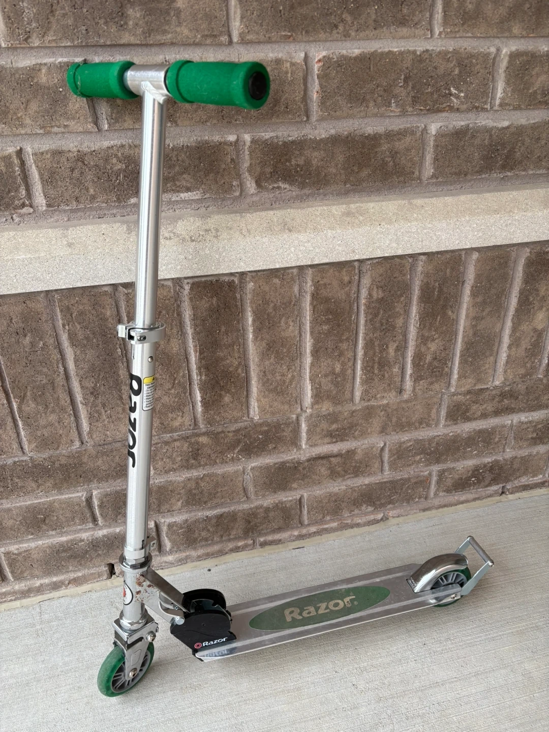 Selling a Razor A kick scooter in silver with green accents. It's in good condition and ready for some fun rides! Great for kids and adults alike who want a lightweight and portable way to get around. Perfect for cruising around the neighbourhood or park