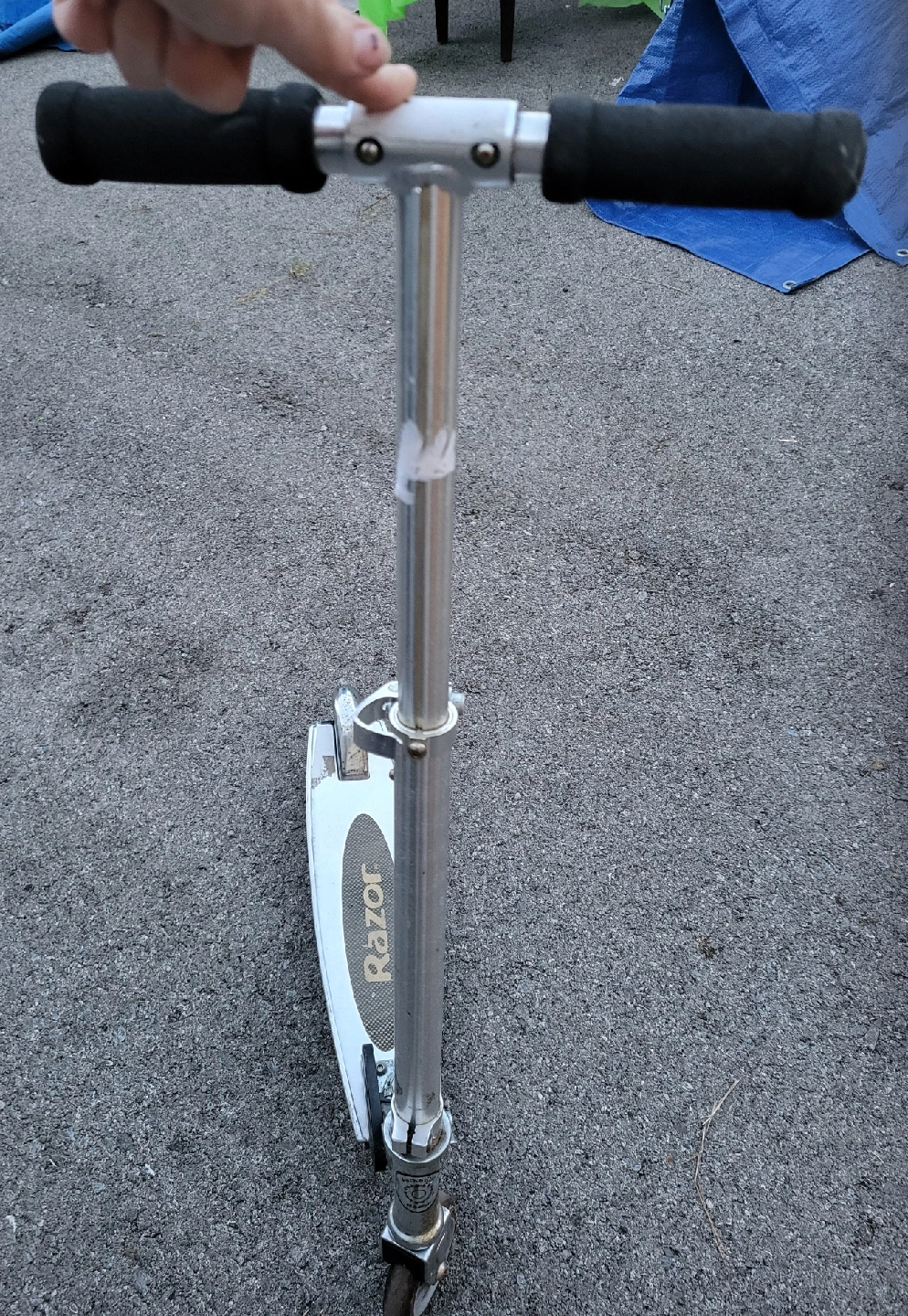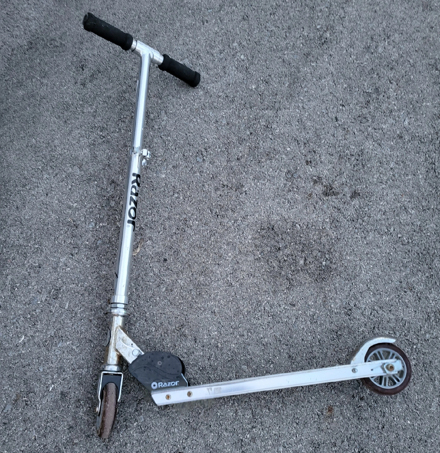 Selling a used Razor scooter in silver. It's perfect for kids who want to have fun outdoors. Some signs of wear, but still lots of life left.