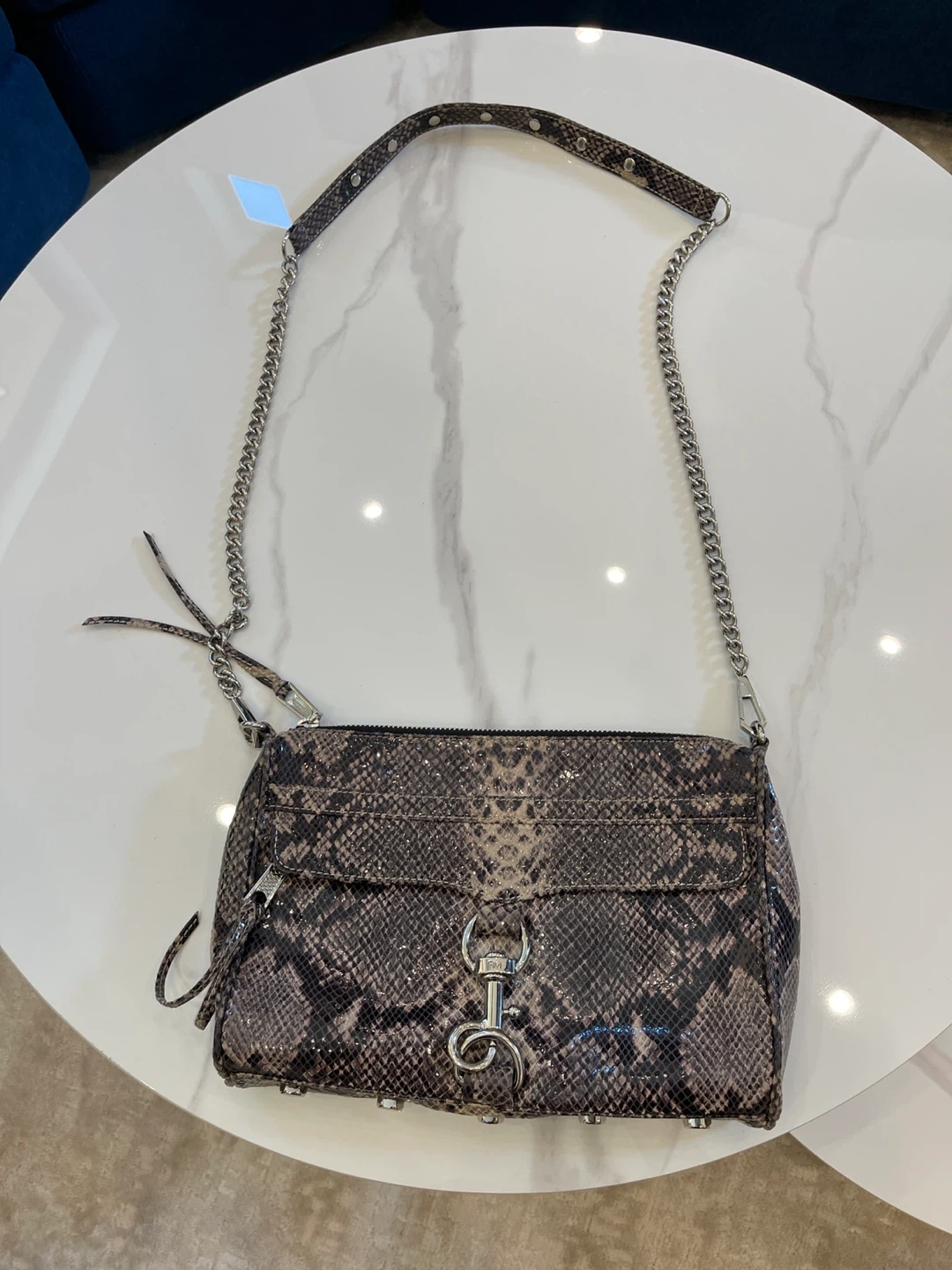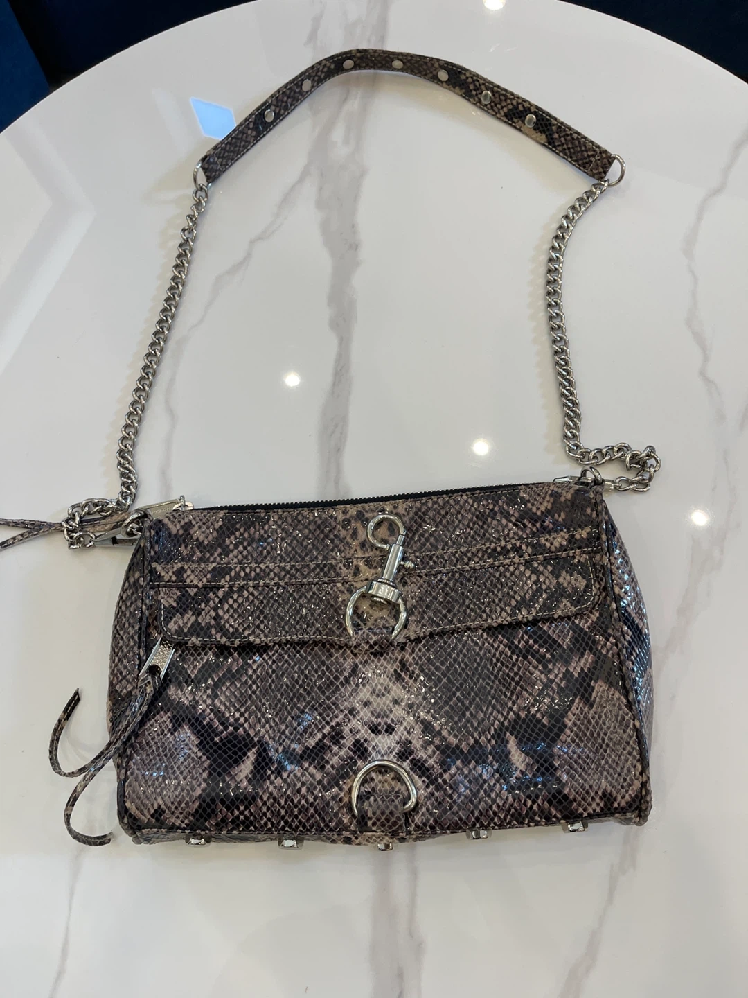 Selling a Rebecca Minkoff crossbody bag with a cool snakeskin pattern! It has a chain strap and unique hardware. This bag is perfect for adding a bit of edge to your outfit. It's in great condition and ready for a new home