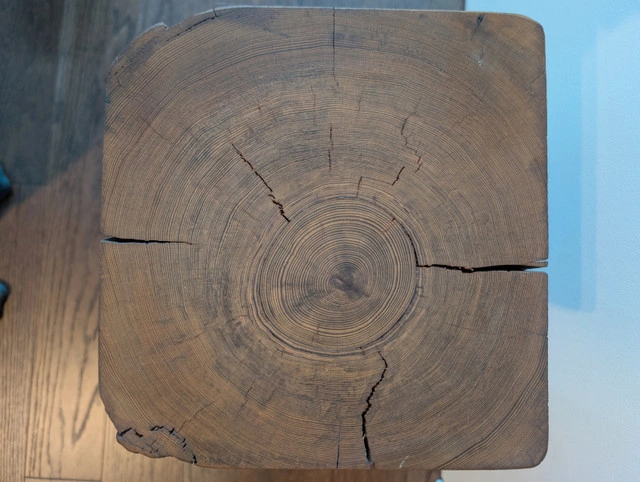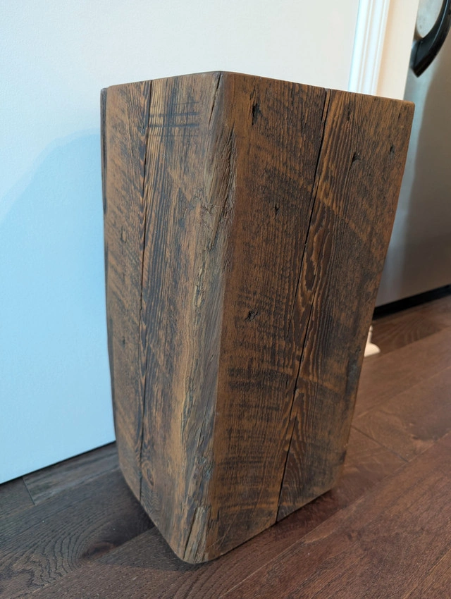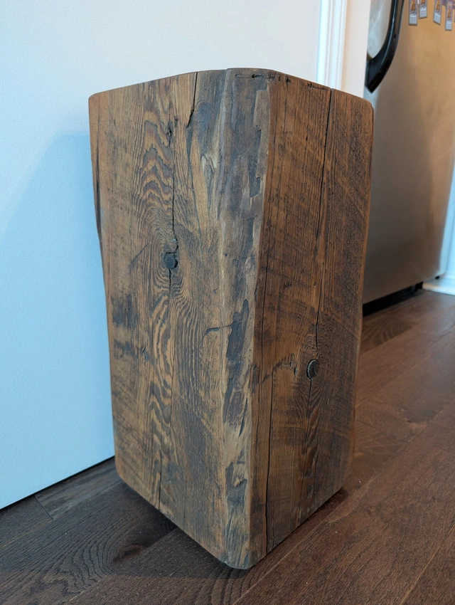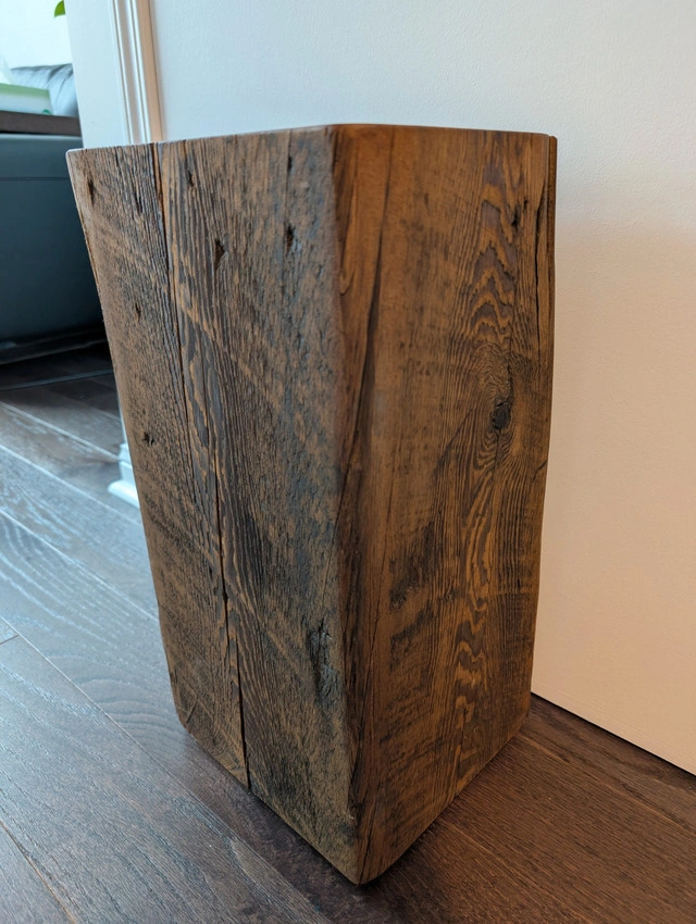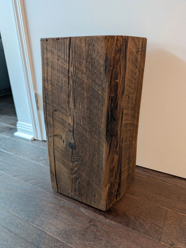 Own a piece of Toronto history with this side table. Created from old growth Hemlock reclaimed from the Toronto Ferry Terminal Wharf circa 1912. They discovered the wharf while excavating for a condo development down at Bay and Harbor in January of 2007. A great accent piece in any space which can also be used as a plant stand or art plinth. Dimensions: 9.5"x9.5"x19". I'm located at King St W and Strachan. Only selling as I will be moving soon.
