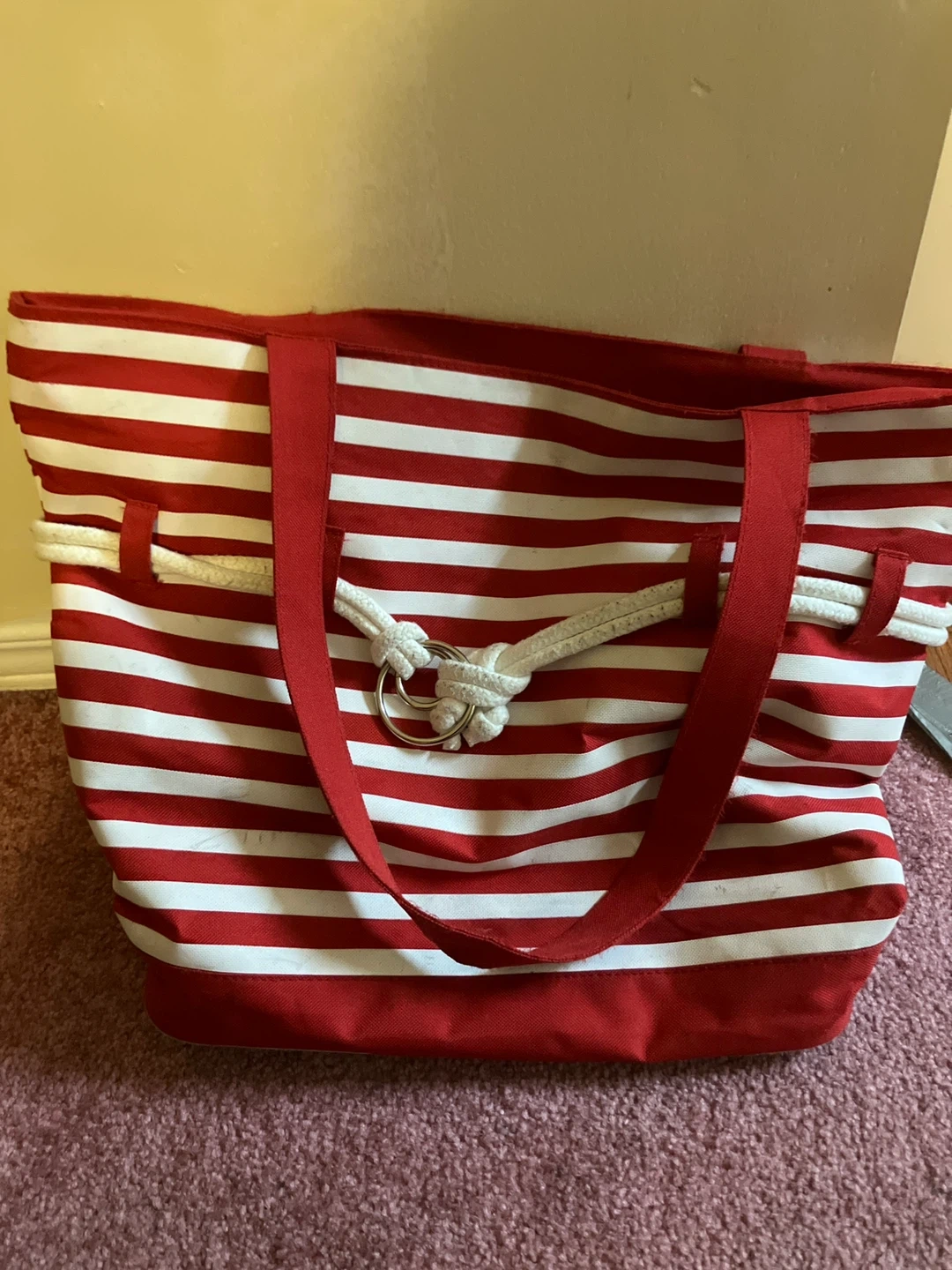 Red and white striped tote bag with red handles. It has some wear, but is still very sturdy. Great for the beach or everyday use! I’m open to trading as well.
