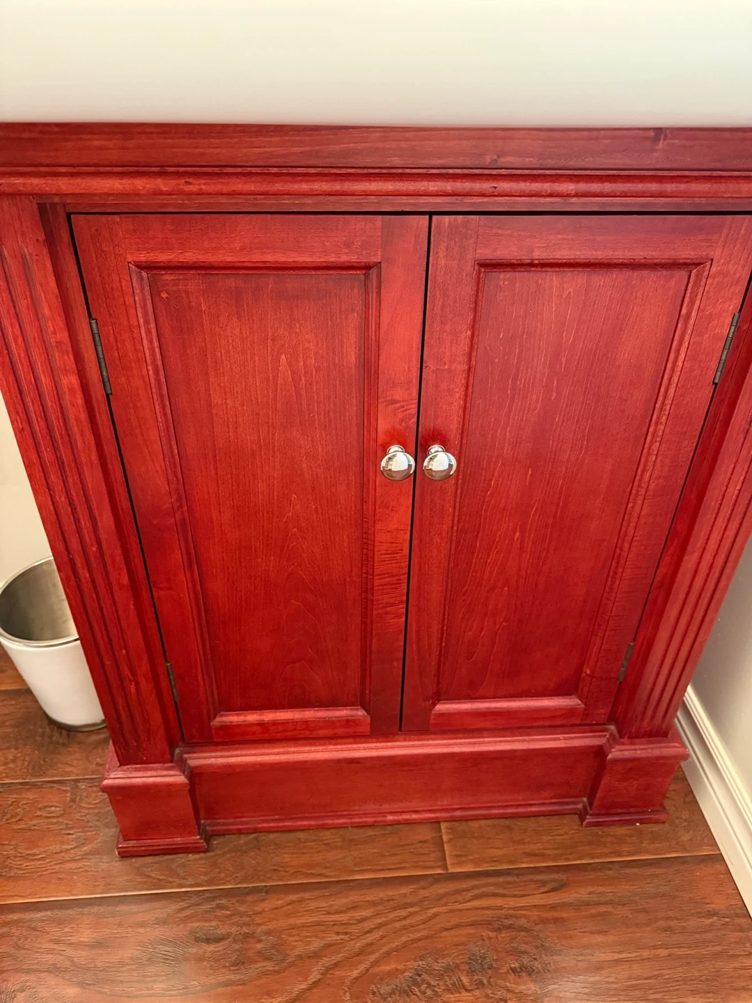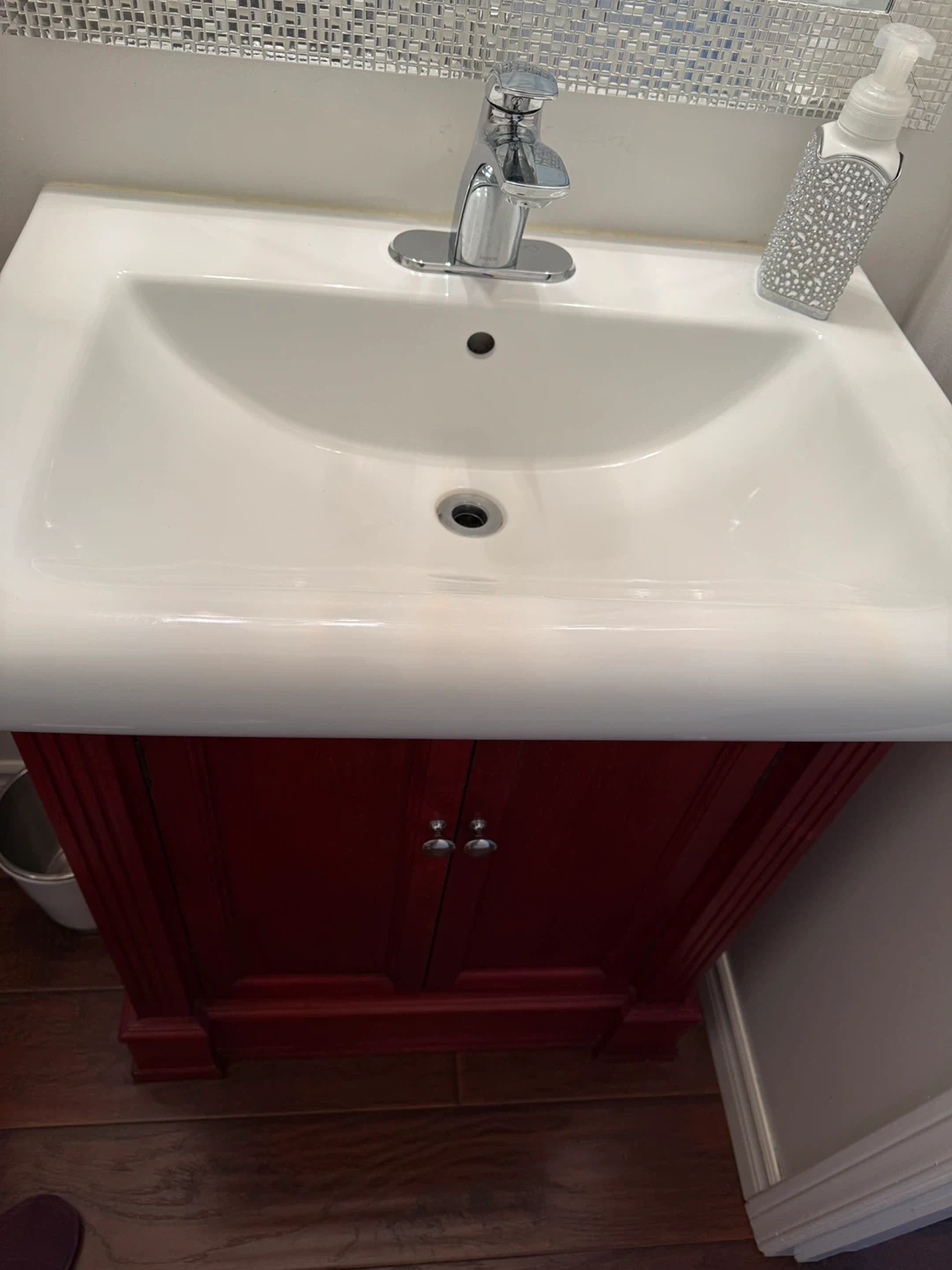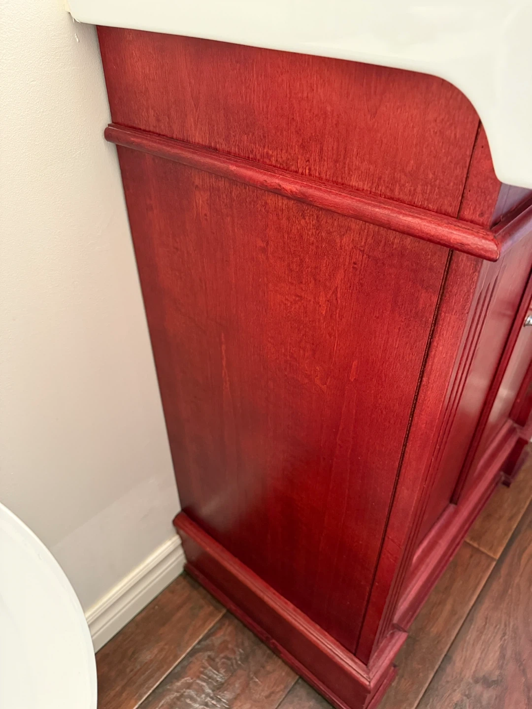 Here's a red bathroom vanity with a sink. It's in excellent condition and ready to be installed in your bathroom. The vanity has a cabinet with doors for storage. Please take a look at the photos to see the details with faucet.