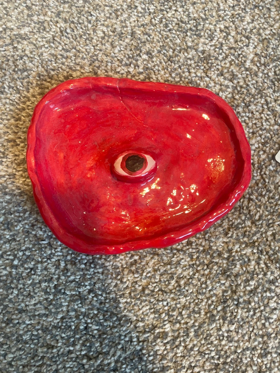 Selling a unique red ceramic dish with an eye design. It's a quirky piece, perfect for holding small items or as a decorative accent. It has a glossy finish and a handmade feel. If you're looking for something different, this could be it!