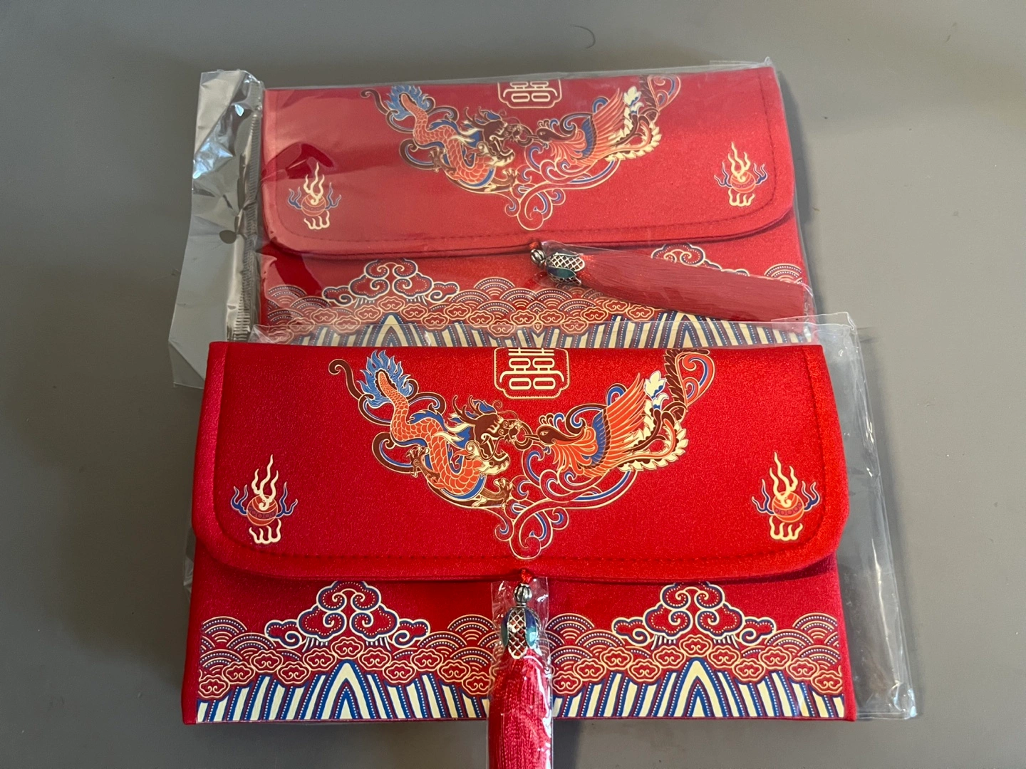 These red envelopes are brand new and perfect for a Chinese wedding. They feature a beautiful dragon and phoenix design with the Chinese character for double happiness (囍). The envelopes are red with gold accents and a tassel. One side says 'Best Wishes'. They are still in their original packaging.